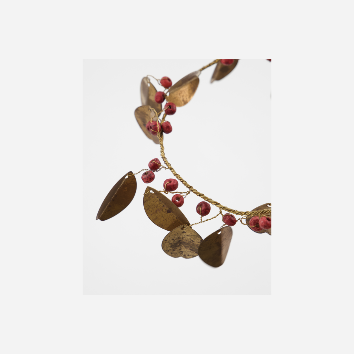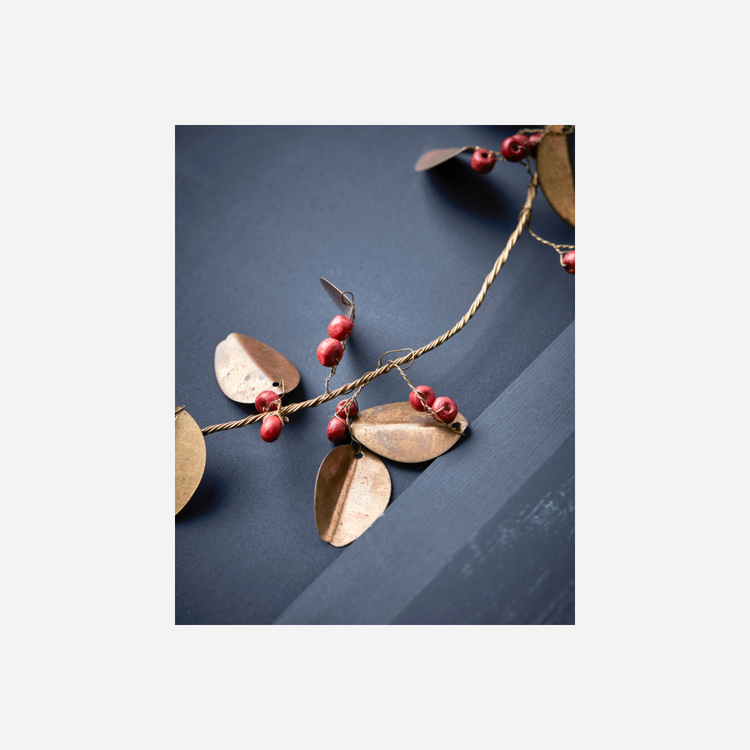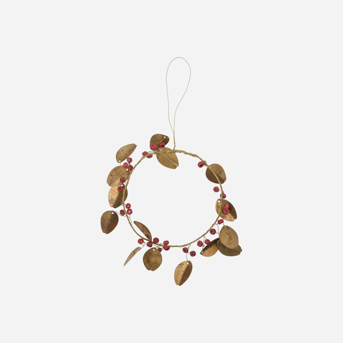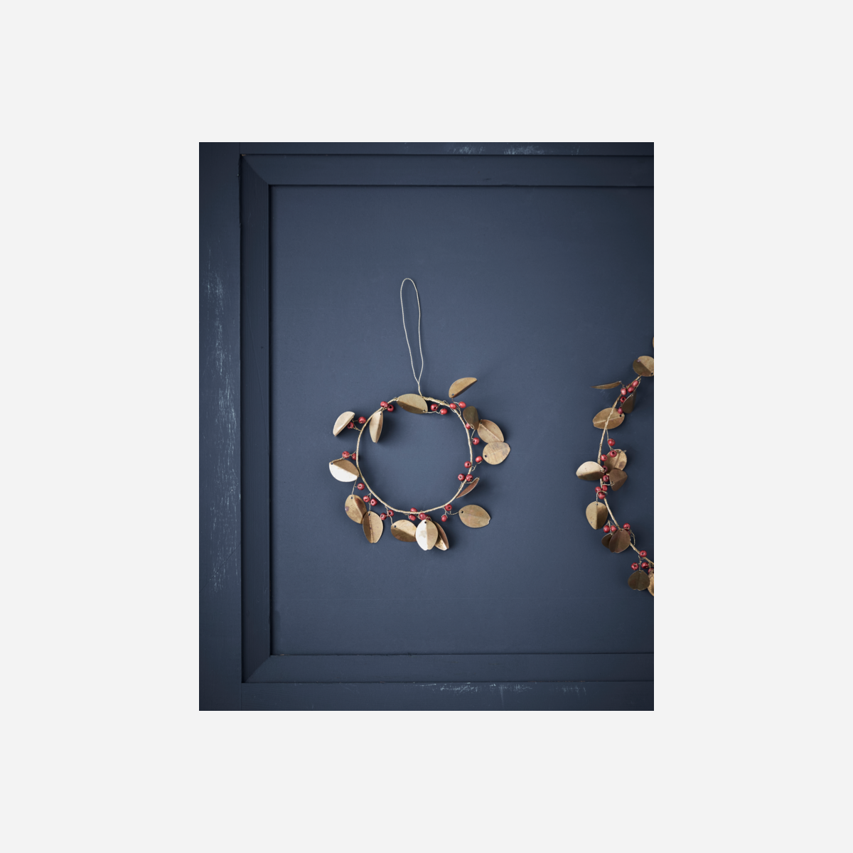 Nichts schlägt einen Kranz, wenn es um Weihnachtsdeko geht. Schmücke dein Zuhause mit diesem kleinen, handgemachten Kranz mit goldenen Messingblättern und roten Holzperlen von House Doctor. Lässige Eleganz für festliche Anlässe - häng den Kranz an die Wand, oder ins Fenster, um eine gemütliche und weihnachtliche Stimmung zu schaffen.