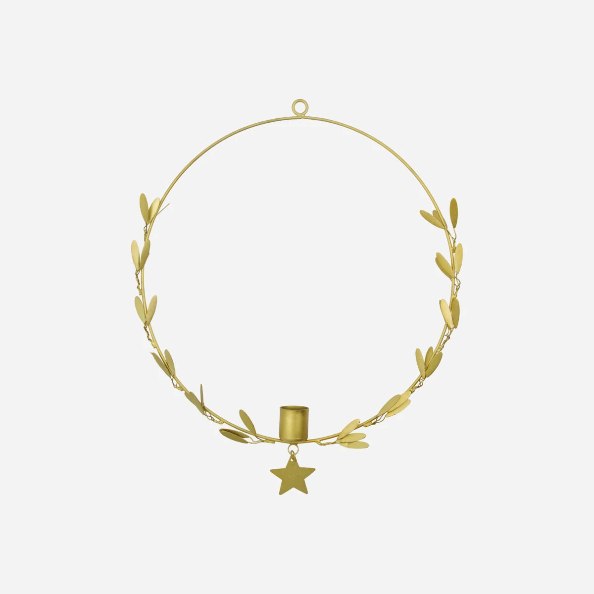 Kerzen sind nicht nur auf dem Tisch ein Hingucker. Mit diesem Kerzenhalter von House Doctor kannst du zu Weihnachten das Licht von der Decke hängen lassen. Der hängende Kerzenhalter mit Messingoptik, Blättern und einem Stern lässt sich prima oben mit einem Band schmücken. Danach einfach eine LED-Kerze hinzufügen und fertig ist der elegante Blickfang. Ideal für Ecken in der Wohnung, die keinen Platz für normale Kerzenhalter bieten. Für einen persönlichen Ausdruck, den Ring mit leichtem Schmuck oder ein paar Zweigchen dekorieren. Aufgrund der Größe des Kerzenhalters, empfehlen wir LED-Kerzen von maximal 16 cm.