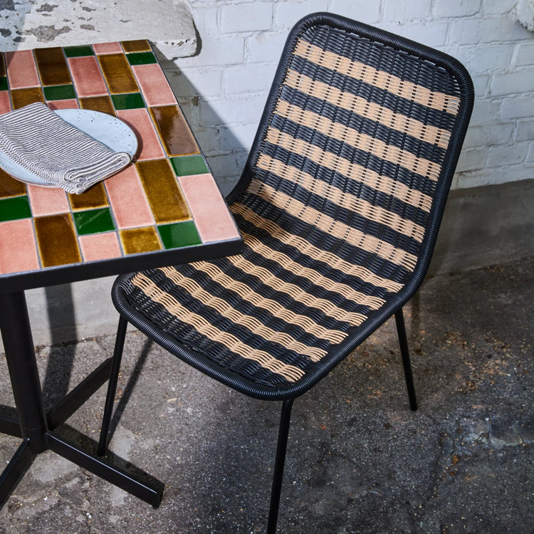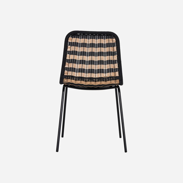 Erleben Sie den Charme und die Vielseitigkeit, die dieser stilvolle Stuhl Ihrem Essbereich verleiht. Mit einem kantigen Design aus Polyethylen und stabilen schwarzen Eisenbeinen, ist er sowohl für Innen- als auch Außenbereiche geeignet. Die natur- und schwarz gestreifte Sitzfläche kombiniert Ästhetik und Funktionalität und macht den Stuhl zu einem unverzichtbaren Blickfang im Garten oder auf der Terrasse.- Einfache Montage erforderlich.- Innen- und Außenbereich geeignet.- Polyethylen Sitzfläche.- Schwarzes Eisengestell.Verleihen Sie Ihrem Essbereich eine stilvolle Note mit diesem einzigartigen Stuhl.