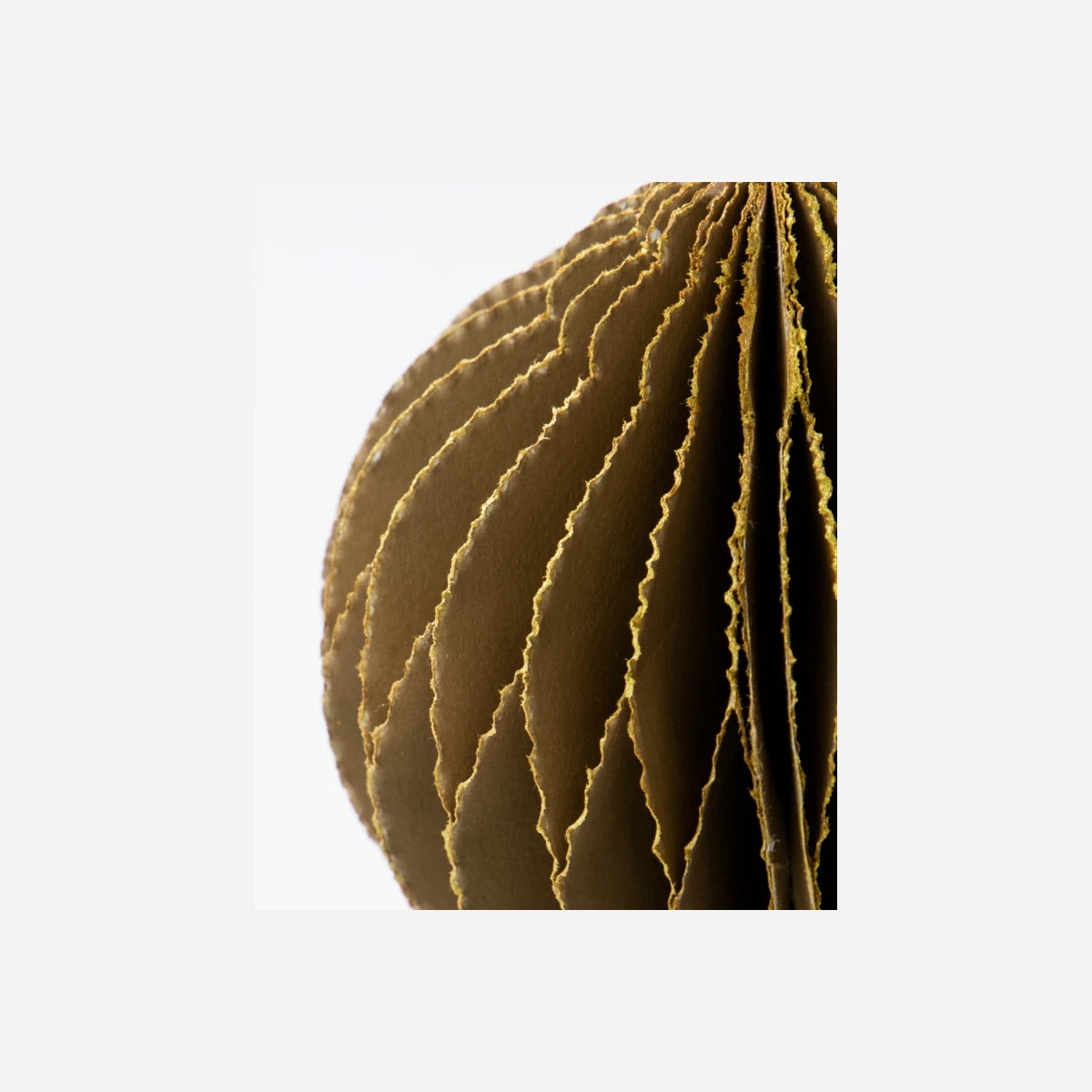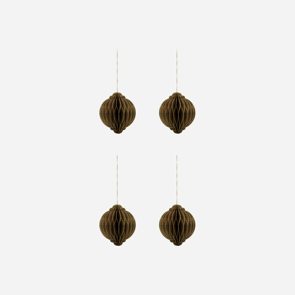 Handgefertigte Papierornamente bereichern Ihre Weihnachtsdekoration mit einem Hauch von Eleganz und Wärme. Die braunen Ornamente besitzen eine honigwabenartige Struktur mit handbemalten Goldglitter-Kanten, die das Licht auf magische Weise einfangen.