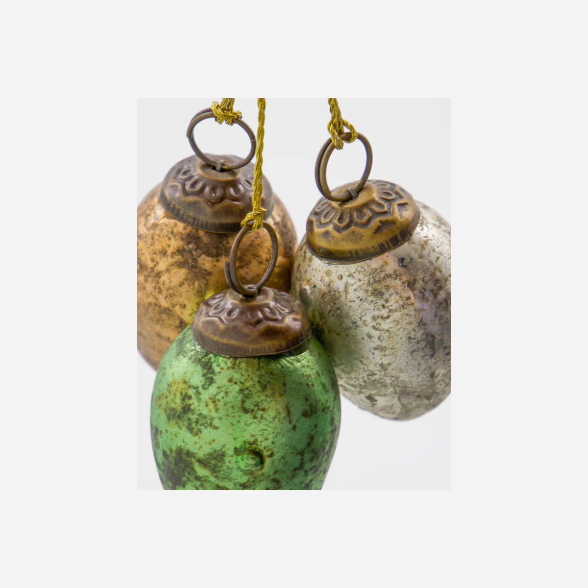 Zwölf Glasornamente mit einzigartigem, patiniertem Glaseffekt. Enthält drei Farbvarianten in Grün, Rosa und Off-White für einen Vintage-inspirierten Look. Inklusive Aufhängefäden.