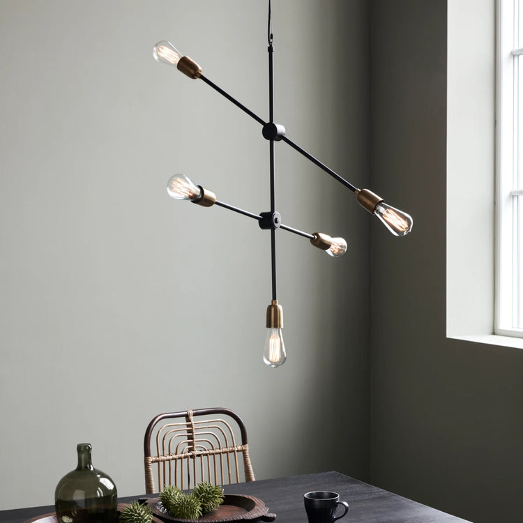 Lampen sind unverzichtbare Elemente, wenn Sie eine persönliche, gemütliche Einrichtung gestalten wollen. Die schöne Molecular Lampe von House Doctor ist eine nahezu Skulptur-ähnliche Lampe, die als praktische Lichtquelle dient und gleichermaßen einen Hauch von Persönlichkeit in Ihr Zuhause bringt. Die Lampe besteht aus fünf Messingfassungen, die an schwarzen, verstellbaren Stangen befestigt sind. Die Lampe ist eine hübsche Dekoration - sowohl ein- als auch ausgeschaltet. Hängen Sie sie über Ihren Esstisch oder in eine Ecke Ihres Wohnzimmers, oder nutzen Sie sie als elegante Lichtquelle in Ihrem Flur. Glühbirnen nicht inklusive. Maße: B.: 68 cm, H.: 78 cm. E27, Max 25 Watt, 2,5 m Kabel.