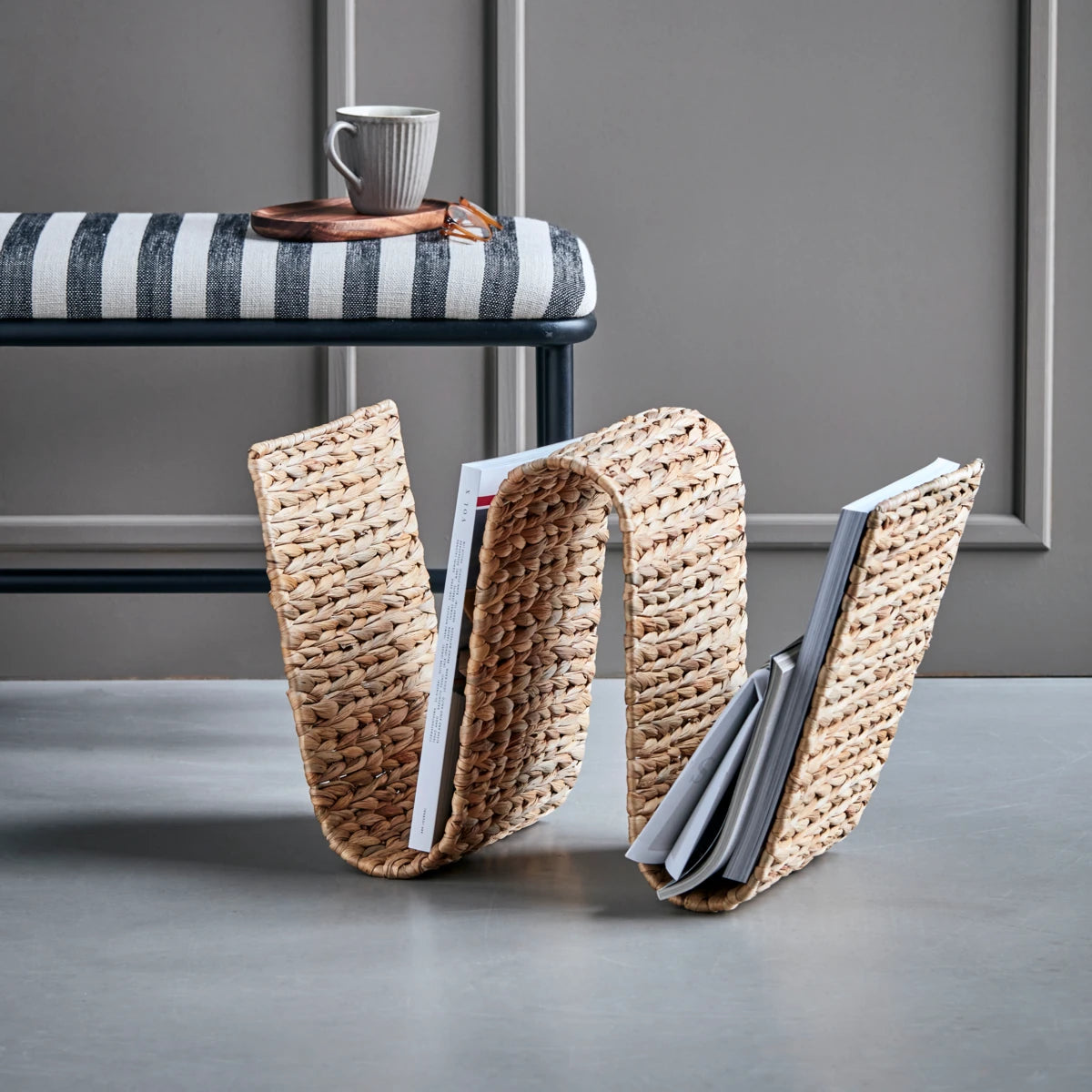 Verleihen Sie Ihrem Arbeitszimmer einen Hauch von natürlicher Eleganz mit diesem skulpturalen Zeitschriftenhalter. Aus Wasserhyazinthe und Eisen gefertigt, bietet er eine stilvolle Lösung zur ordentlichen Aufbewahrung Ihrer Zeitschriften, Bücher und Zeitungen. Die einzigartige Wellenform mit weichen Linien verleiht jedem Raum eine dekorative Note.- Natürliche Wasserhyazinthe- Skulpturale Wellenform- Robuster Eisenrahmen- Stilvolle und funktionale AufbewahrungVerschönern Sie Ihr Arbeitszimmer mit diesem schön gestalteten Zeitschriftenhalter.