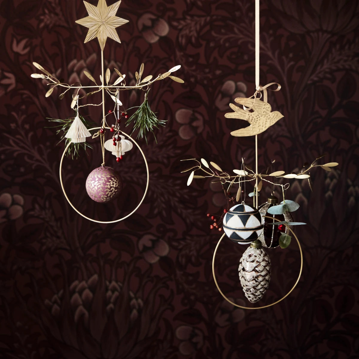 Das handgemachte Mobile von House Doctor sorgt überall für elegante Weihnachtsstimmung. Das Design hat eine goldene Messingoptik, einen Vogel und Blätter, die vorsichtig angepasst werden können. Schmücke den Ring und die kleinen Schlaufen mit deiner Lieblingsdeko und vollende den persönlichen Look mit einem schönen Band. Mit diesem Teil kannst du wirklich auf einfache Weise deine kreativen Fähigkeiten zur Schau stellen.
