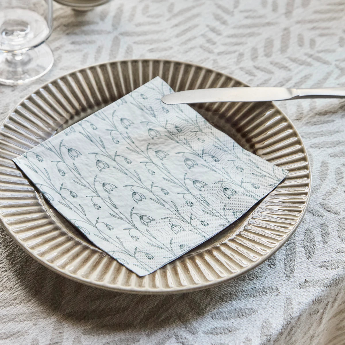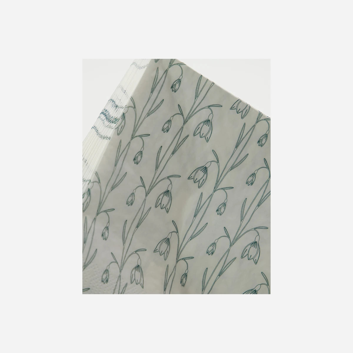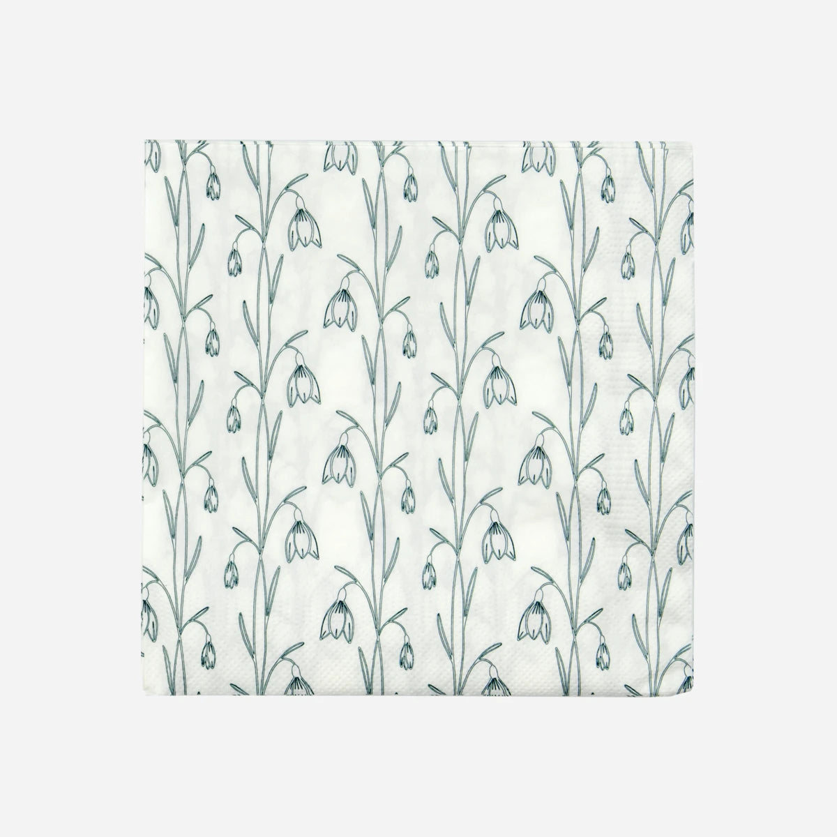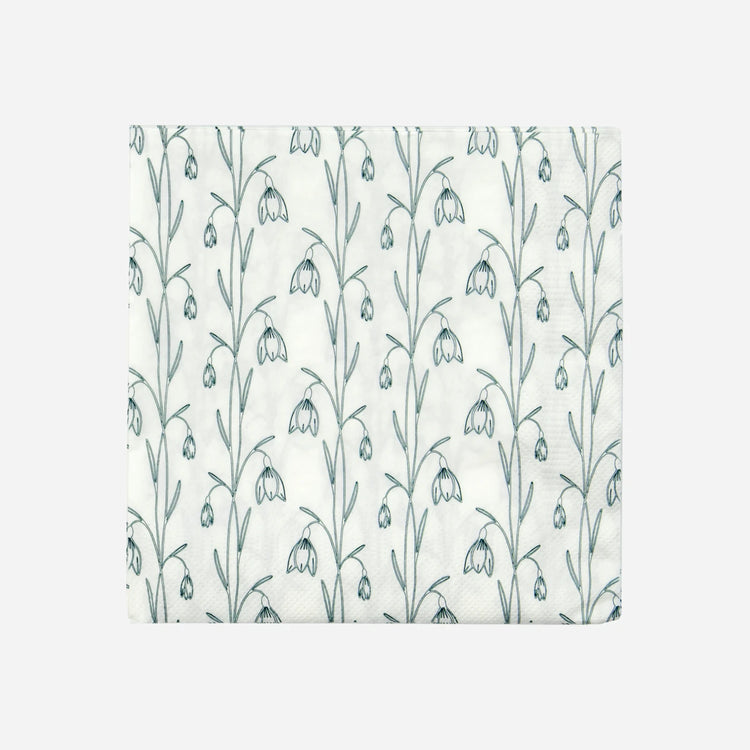 Papierservietten mit detailreichem Schneeglöckchen-Motiv in Weiß und Grün. Die weiche, leicht strukturierte Papieroberfläche macht sie ideal für saisonale und alltägliche Tischdekorationen.