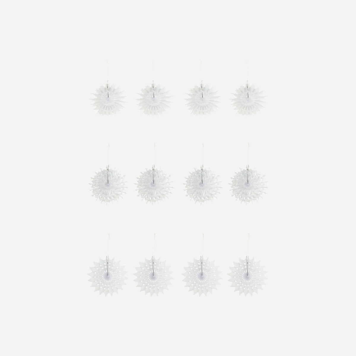 Machen Sie Ihre Einrichtung festlicher mit diesem Set aus 12 Papierfächern in 3 verschiedenen Designs. Handgefertigt und in einem zeitlosen Weiß gehalten, verfügen die Fold-Fächer über komplizierte Formen für einen Hauch von Eleganz. Hängen Sie sie an einen Zweig in einer Bodenvase, an die Wand oder an Ihren Weihnachtsbaum. Überall dort, wo Sie einen Hauch Nostalgie hinzufügen möchten. Das ist die Kraft von Papierdekorationen.