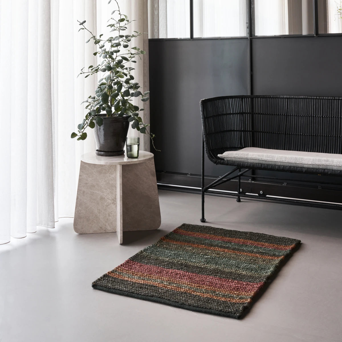Verleihen Sie Ihrer Inneneinrichtung mit dem farbenfrohen Design dieses kleinen Teppichs von House Doctor sofort eine frische Note. Wenn Sie auf der Suche nach einem strapazierfähigen Teppich für stark frequentierte Bereiche wie Ihren Flur oder Ihr Wohnzimmer sind, ist dieser Hanfteppich die Antwort. Die mehrfarbigen Streifen sorgen für Wärme und schaffen eine Balance zwischen auffällig und dezent. Mit seiner kleinen und rechteckigen Größe ist Tori ideal für Ihren Flur, Ihr Schlafzimmer, unter einem kleinen Couchtisch oder in Ihrem Heimbüro.