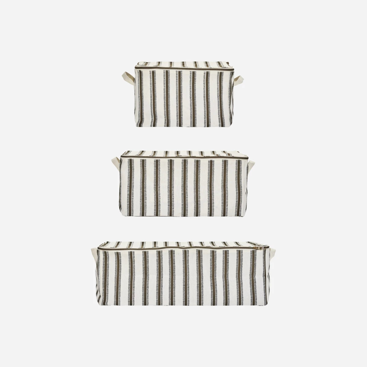 Verleihen Sie Ihrem Zuhause mit diesem Set aus drei praktischen Aufbewahrungsboxen einen Hauch von Eleganz. Die leichten Boxen bestehen aus robustem Canvas mit einem ansprechenden ethnischen Muster in Brauntönen. Dank des langen Reißverschlusses bleiben die Inhalte staubfrei und ordentlich. Sie sind perfekt geeignet für das Schlafzimmer oder den Kleiderschrank und bieten eine stilvolle Möglichkeit, Ordnung zu schaffen.- Leichtes Design mit Reißverschluss- Staubfreies Aufbewahren- Set aus drei Größen- Schönes ethnisches MusterFügen Sie Ihrem Raum stilvolle Organisation hinzu.
