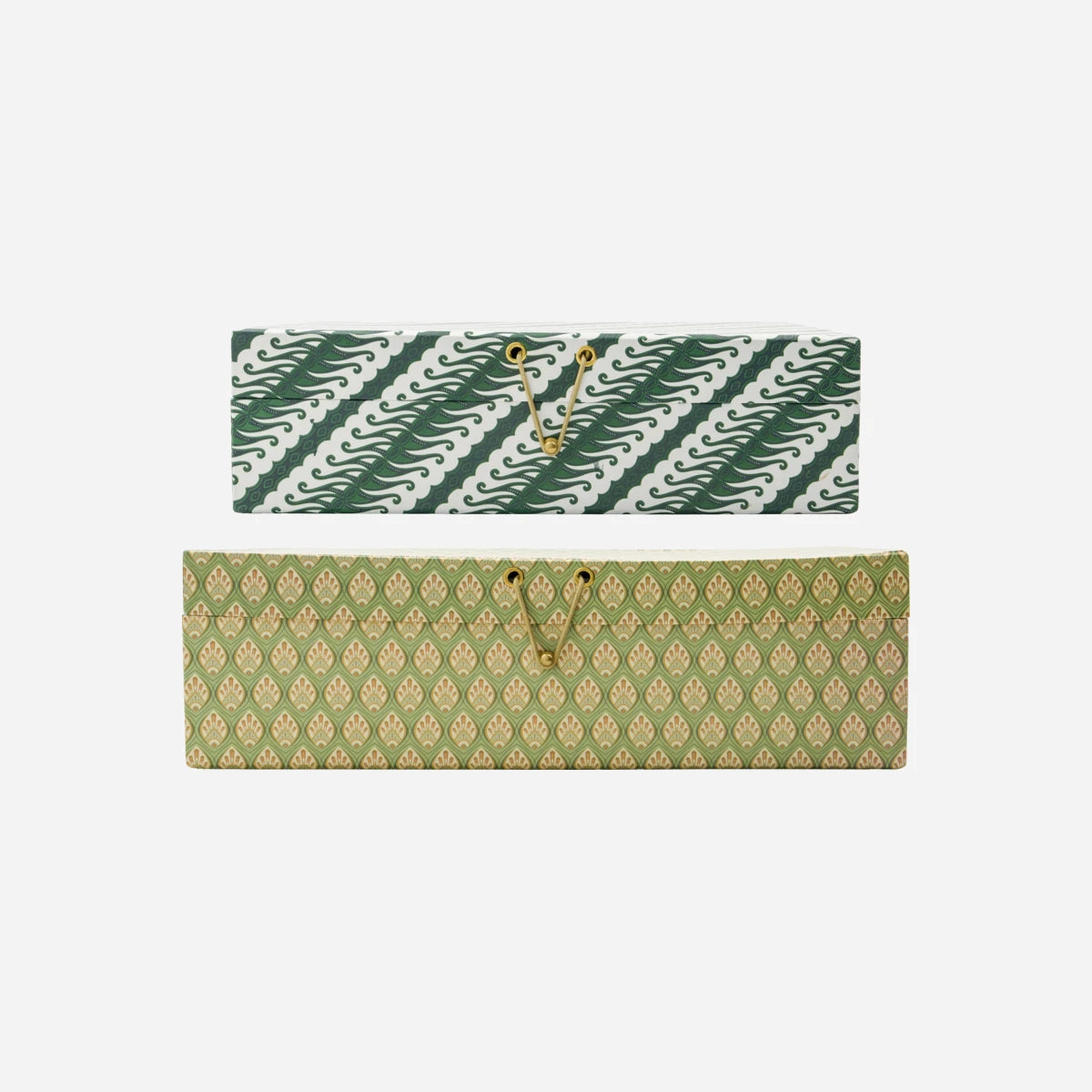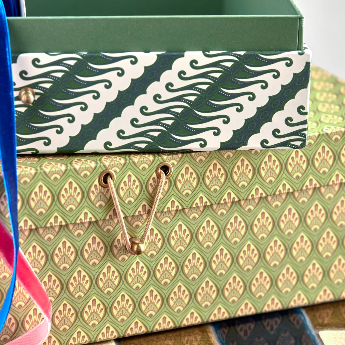 Verleihen Sie Ihrem Home Office mit diesen dekorativen Aufbewahrungsboxen eine stilvolle Note. Die Boxen kommen in zwei Designs und Farben, sowohl in kleinen als auch großen Größen. Sie sind aus Pappe gefertigt und verfügen über ein elegantes Verschlusssystem mit einem goldenen Knopf und einem schwarzen Gummiband. Das Innere der Boxen ist in einer einheitlichen Farbe gehalten, die dem äußeren Design Raffinesse verleiht. Diese Boxen helfen nicht nur bei der Organisation, sondern verschönern Ihren Arbeitsbereich und schaffen eine gemütliche Atmosphäre.- Zwei Designs, zwei Farben- Große und kleine Boxen- Eleganter Verschlussmechanismus- Praktisch und dekorativBringen Sie Ordnung und Stil in Ihr Home Office mit diesen einzigartigen Aufbewahrungsboxen!