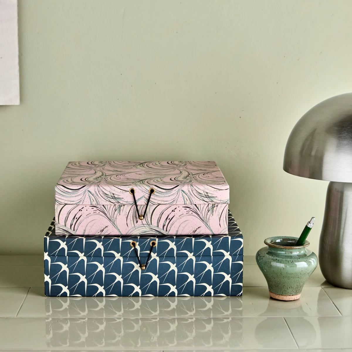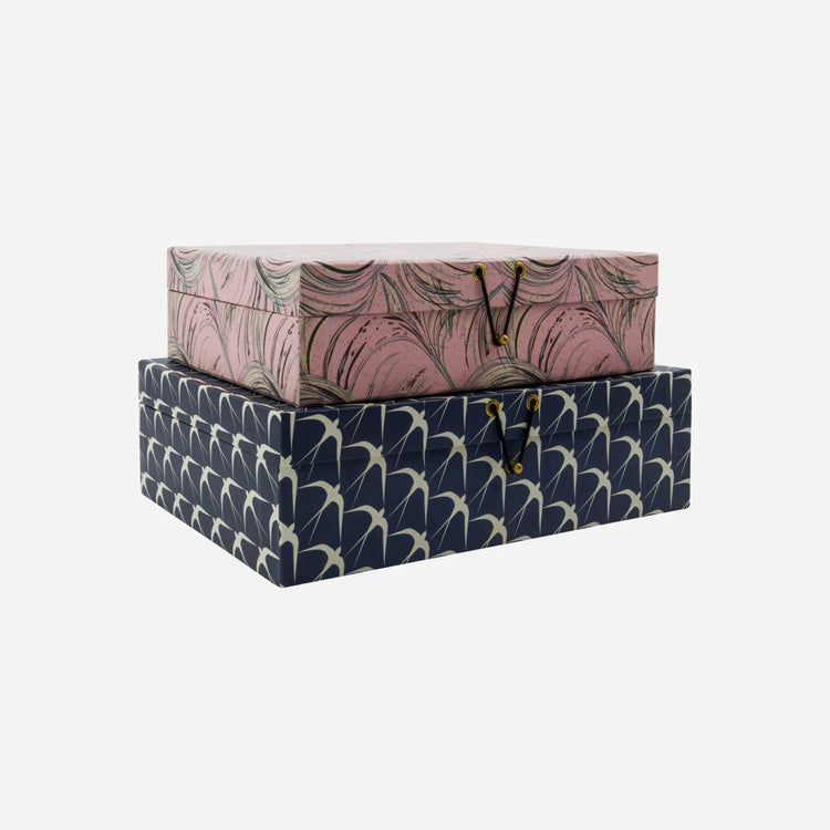 Schaffe Ordnung mit Stil. Dieses Set aus zwei dekorativen Aufbewahrungsboxen ist die perfekte Lösung, um deine Kleinigkeiten zu organisieren. Die Boxen kommen in einem tollen Kontrast aus Pink und Dunkelblau daher und sind ideal für Büromaterial, Dokumente und andere Habseligkeiten.