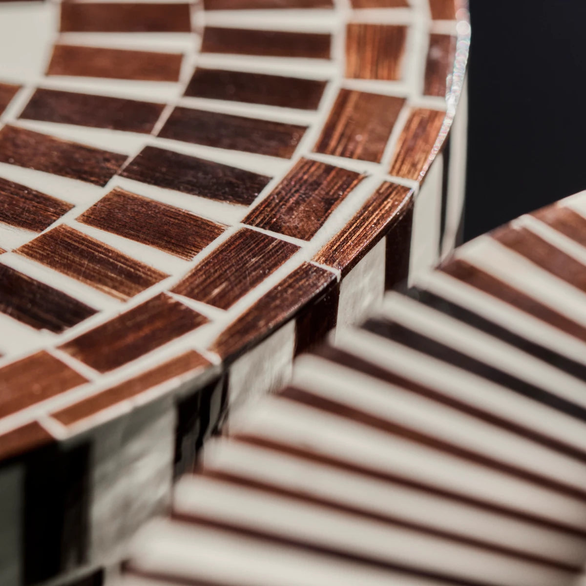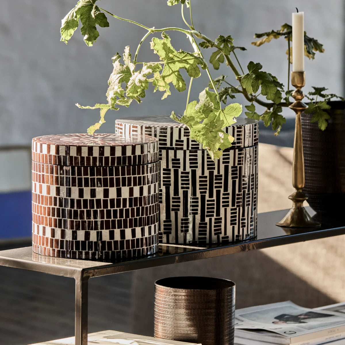 Diese Aufbewahrungsboxen aus Bambus vereinen Funktionalität und Stil. Mit handgefertigten Mosaikmustern in dunklen Brauntönen und Cremefarben sind sie ein kunstvolles Deko-Element. Setzen Sie diese Boxen in Ihrem Wohnzimmer oder Schlafzimmer ein, um Ihren persönlichen Stil zu unterstreichen und gleichzeitig für Ordnung zu sorgen.- Einzigartige Mosaikmuster- Set aus zwei Größen- Aus MDF und Bambus- Dekorativ und funktionalVerleihen Sie Ihrem Wohnraum mit diesen stilvollen Aufbewahrungsboxen einen Hauch von Persönlichkeit.