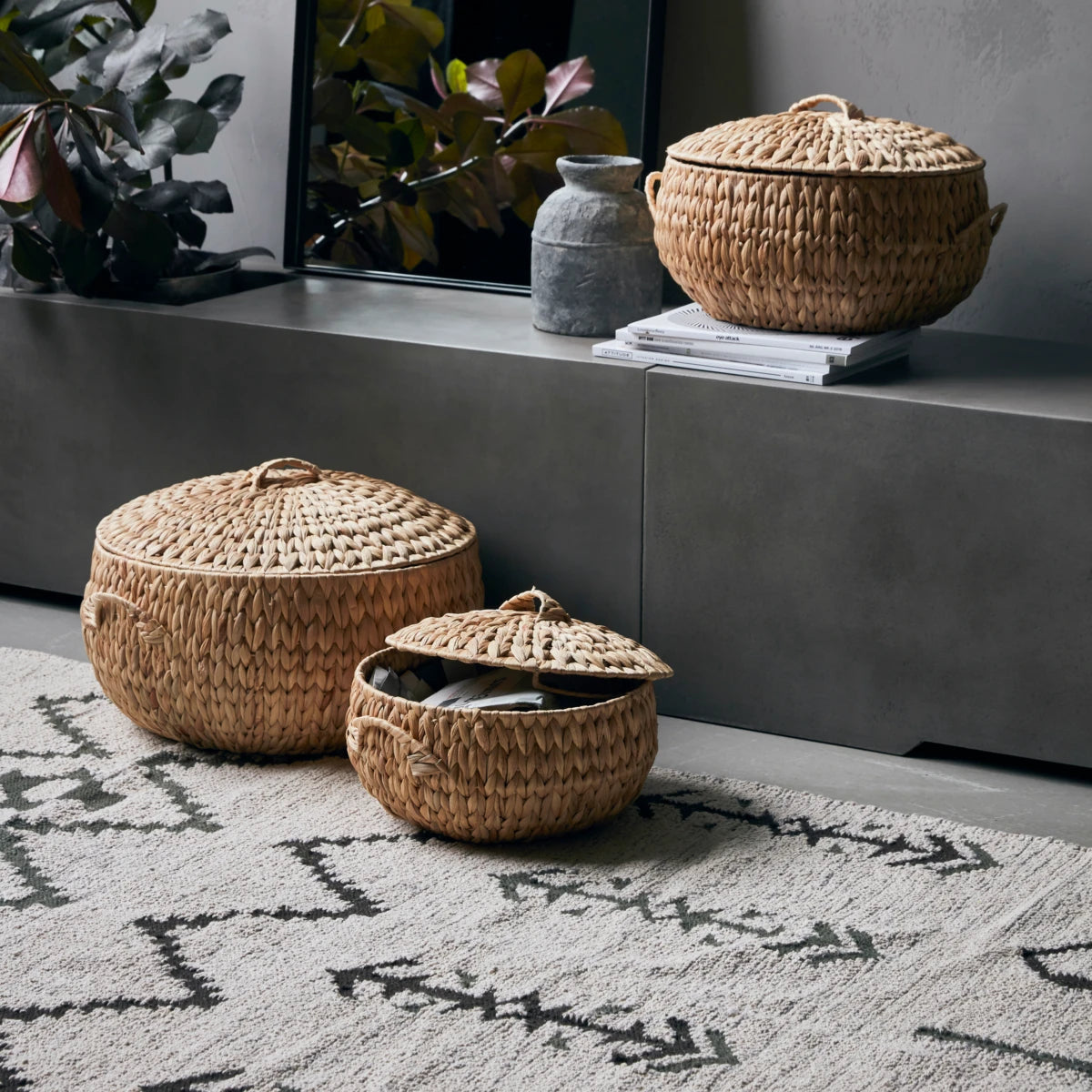 Dieses Set aus drei handgeflochtenen Körben von House Doctor bietet dir zahlreiche Aufbewahrungsmöglichkeiten. Das Design aus handgeflochtener Wasserhyazinthe sorgt bei den Rata-Körben für eine weiche Ausstrahlung und einen schönen Kontrast zu glatten Oberflächen in deiner Inneneinrichtung. Sowohl Korb als auch Deckel sind mit Griffen ausgestattet, sodass du die Körbe ganz leicht umstellen kannst. Verwende sie, um Zeitschriften, Strickzeug oder Krimskrams elegant im Wohnzimmer, Flur oder in der Küche zu verstauen. Wenn du die Körbe dann noch mit anderen Aufbewahrungslösungen aus unserer Wasserhyazinthen-Kollektion kombinierst, erhält dein Zuhause einen perfekt abgestimmten Look.