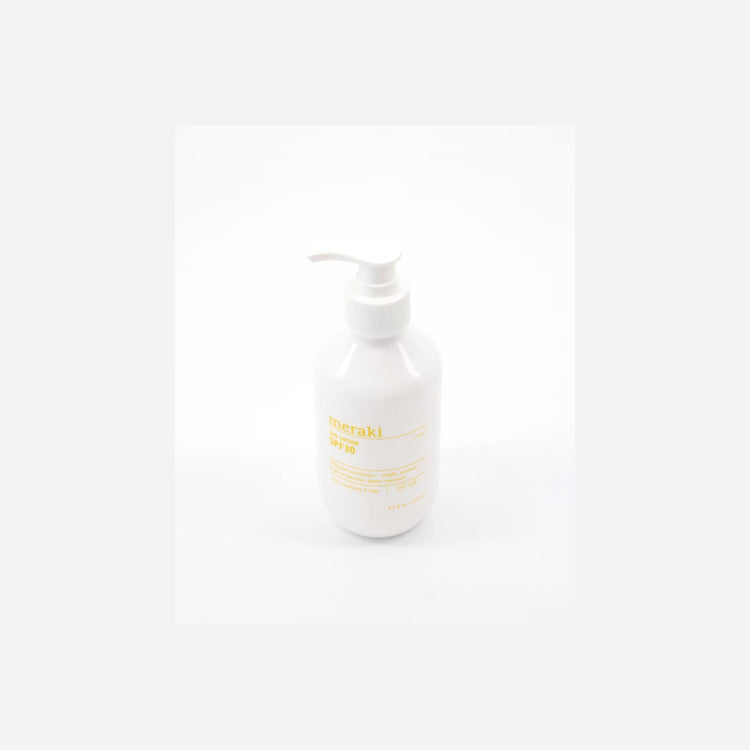 Schütze deine Haut mit der wasserfesten Sun Lotion mit SPF 30 und versorge sie gleichzeitig mit Feuchtigkeit. Schädliche UV-Strahlen werden wirksam von den chemischen UVA- und UVB-Filtern absorbiert, die keine weißen Rückstände und auch kein fettiges Hautgefühl hinterlassen. Die Sonnencreme wurde mit Vitamin E angereichert, damit deine Haut weich und geschmeidig bleibt. Die Sun Lotion von Meraki zieht schnell ein und duftet nach frischer Minze und weißem Moschus. Für Veganer geeignet.Creme großzügig auf der Haut verteilen. Mit dem Ankleiden warten, bis die Creme vollständig eingezogen ist. Für optimalen Schutz bei längeren Aufenthalten im Freien wiederholen.