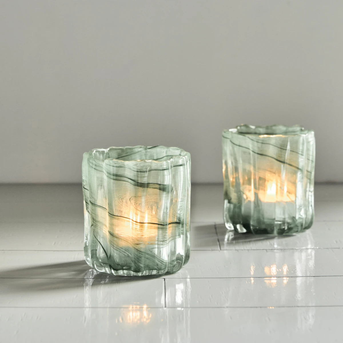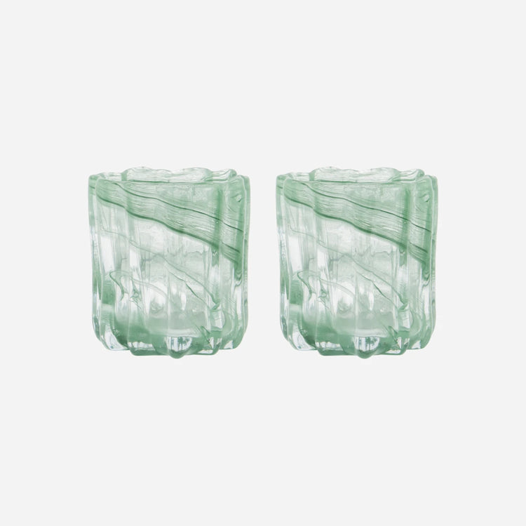 Schaffe eine warme und einladende Atmosphäre mit diesem Set aus zwei Teelichthaltern aus handgefertigtem Glas. Ihr geriffeltes, geschwungenes Design verleiht ihnen einen organischen und skulpturalen Look. Das dickwandige Glas, das feine Wirbelmuster und der zarte Grünton sorgen für ein besonders weiches und stimmungsvolles Licht.