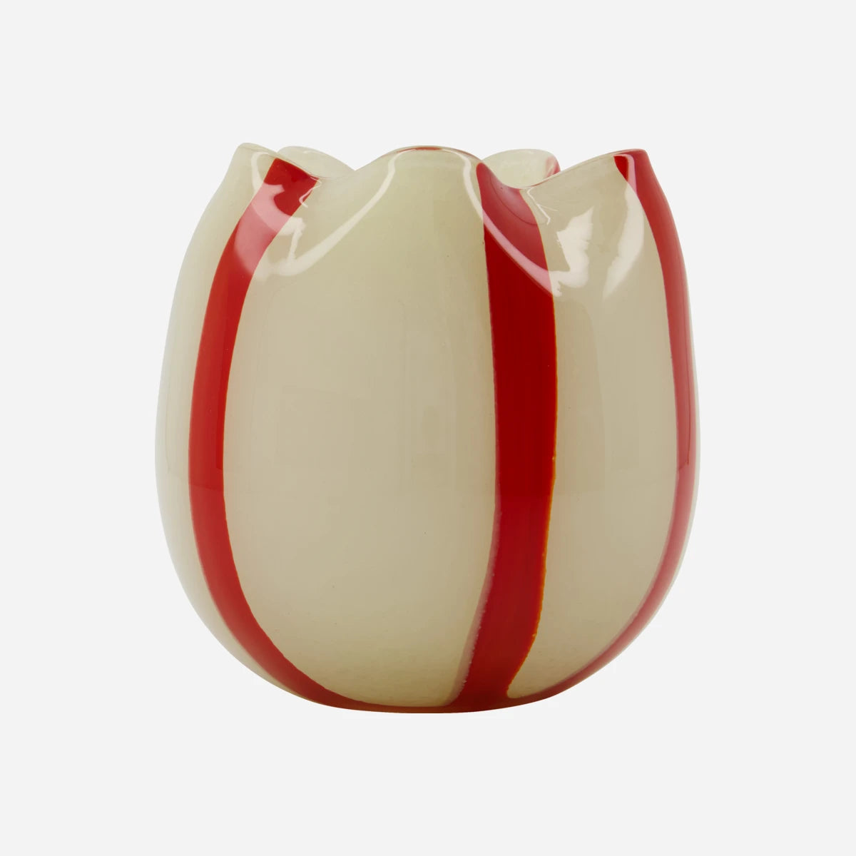 Hergestellt aus mundgeblasenem Glas, bringt dieser Teelichthalter eine frische Atmosphäre und einen farbenfrohen Akzent in Ihre Einrichtung. Mit seiner cremeweißen Basis und roten Streifen kann er auch als ansprechende kleine Vase verwendet werden und verleiht Ihrem Raum Vielseitigkeit.- Mundgeblasenes Glas- Einzigartiges handgefertigtes Design- Vielseitig einsetzbar- Durchgefärbtes Glas mit StreifenVerleihen Sie Ihrem Zuhause eine künstlerische Note.