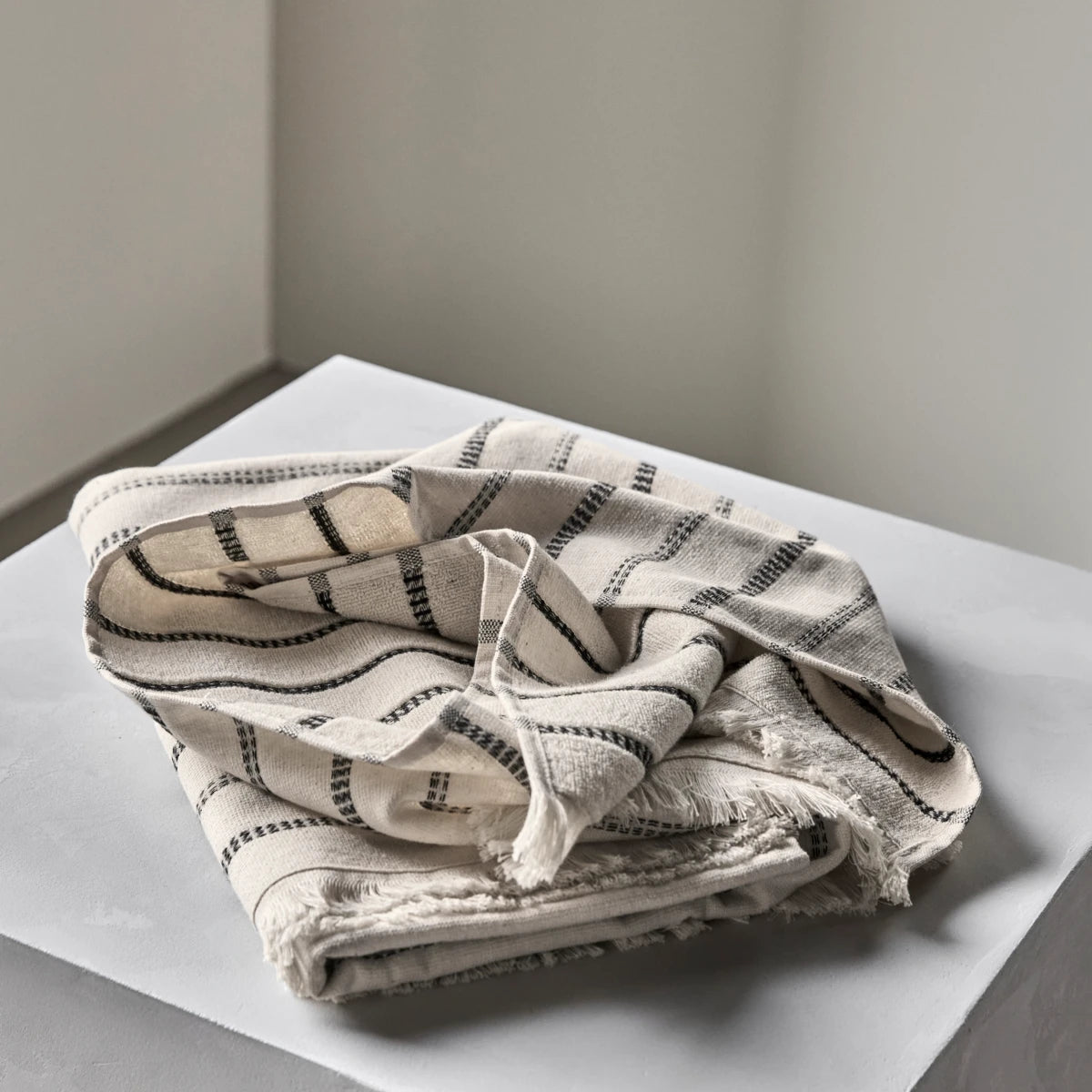 Dieses luxuriöse Handtuch im Hammam-Stil verwandelt Ihr Badezimmer in eine Wellness-Oase. Die eleganten schwarz-cremefarbenen Streifen und die exquisiten Fransen verleihen ihm einen zeitlosen Charme. Die weiche Baumwollmischung sorgt für höchsten Komfort.