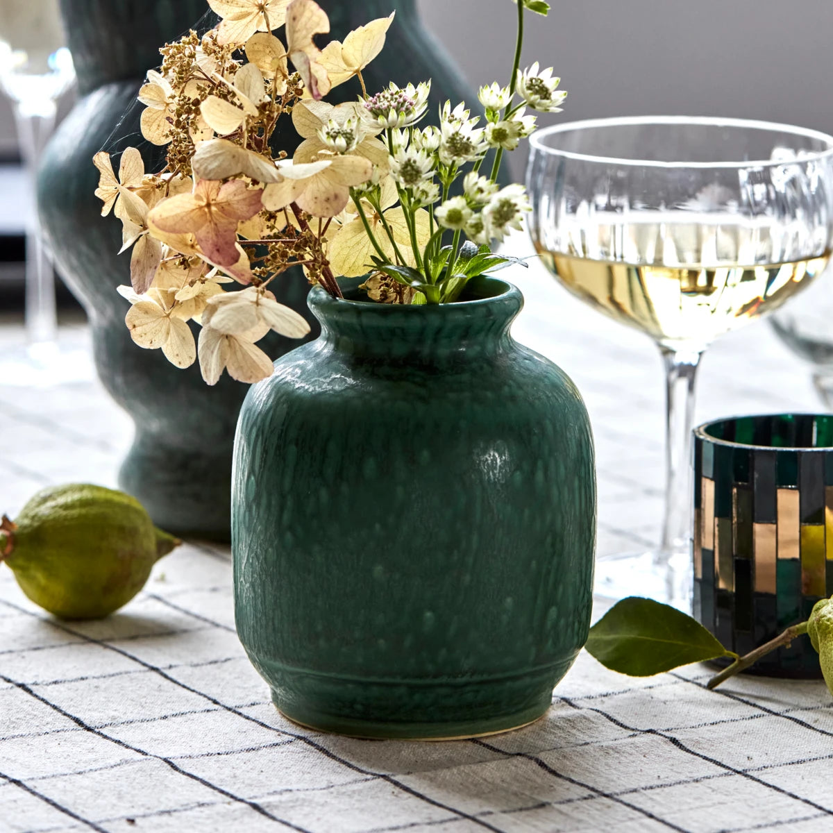 Mit seiner schönen Glasur in grünen Nuancen bringt dieser Keramikvase einen Hauch von Charme in Ihr Zuhause. Perfekt für kleine Blumensträuße, setzt sie Akzente auf dem Esstisch, einem Beistelltisch oder im Regal. Durch ihre kompakte Größe und das schlichte Design lässt sie sich wunderbar in verschiedene Einrichtungsstile integrieren und kann kreativ mit anderen Dekorationsartikeln kombiniert werden. Steinzeug verleiht der Vase eine langlebige und zeitlose Erscheinung.- Glasur in grünen Nuancen.- Ideal für kleine Sträuße.- Passt zu verschiedenen Stilen.- Robust und zeitlos.Kombinieren Sie mit einem Teelichthalter für ein stimmiges Dekorationsensemble.