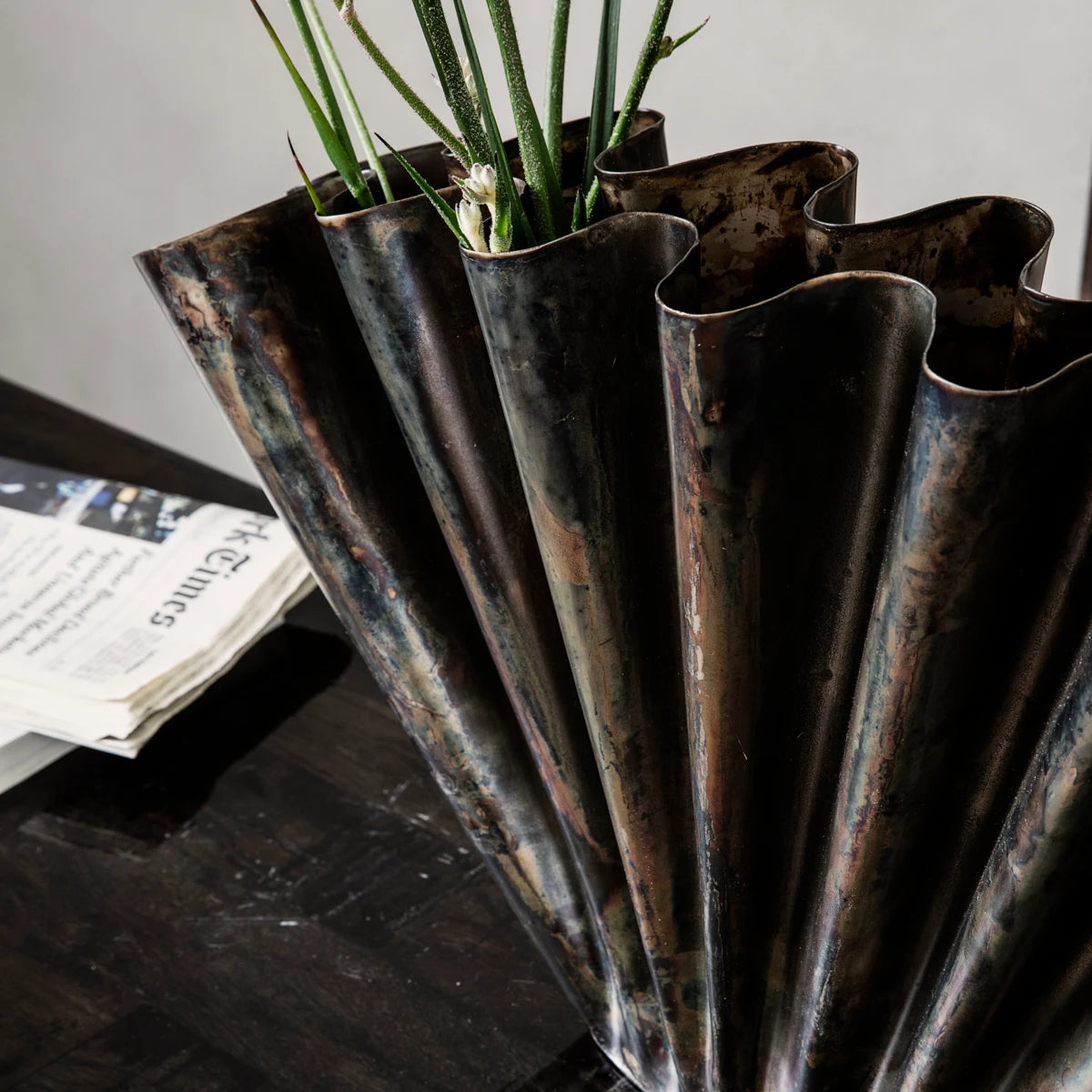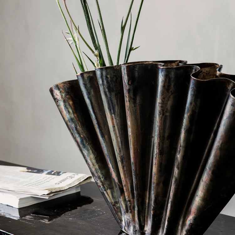 Richten Sie Ihr Zuhause mit hübschen Vasen ein, die Charakter in Ihre Einrichtung bringen und die Blicke auf sich ziehen. Diese hübsche Vase von House Doctor ist unabhängig vom jeweiligen Einrichtungsstil die perfekte Ergänzung für jedes Zuhause. Die Vase namens Flood ist aus Eisen gefertigt, das in Kombination mit der metallischen Farbgebung einen industriellen und rustikalen Look verleiht. Die einzigartige Vase hat Falten an den Seiten, wodurch ein dynamischer Ausdruck entsteht. Die kleinen Falten halten außerdem Ihre Blumen beisammen, sodass diese nicht zu den Seiten kippen.
