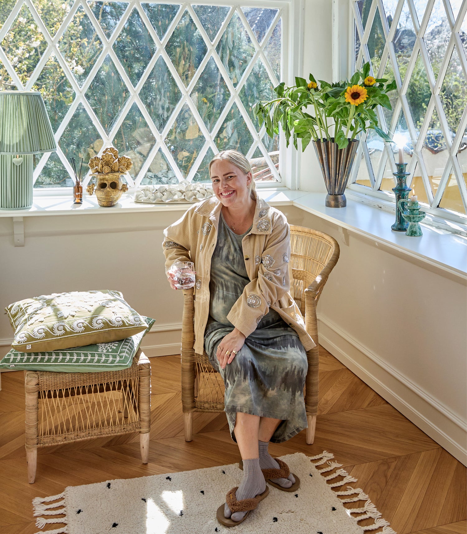The interior evolves over time, guided by what feels right. Here, she has curated a selection of her favourite pieces from House Doctor – from hand-embroidered cushion covers and glazed planters to unique glassware and outdoor furniture, all of which have already found their place in her home.