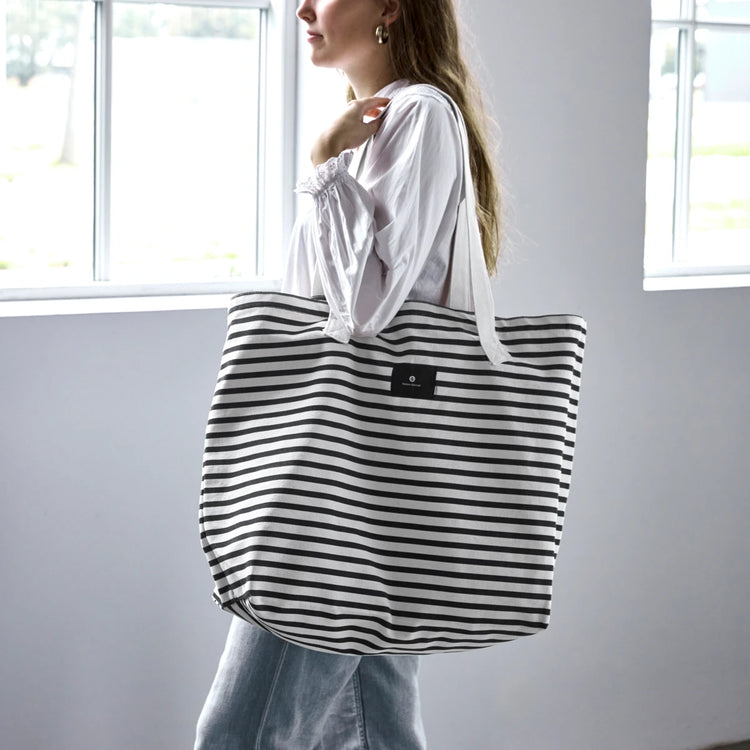 Handcrafted with precision, this spacious canvas bag features a striking design with black stripes on an off-white background. Its roomy interior and cool drawstring closure make it an ideal choice for beach outings, shopping trips, or weekend getaways. The handmade nature ensures each piece is unique, with slight variations in finish and size adding to its charm. This versatile bag combines functionality and style, making it a perfect addition to your wardrobe accessories.