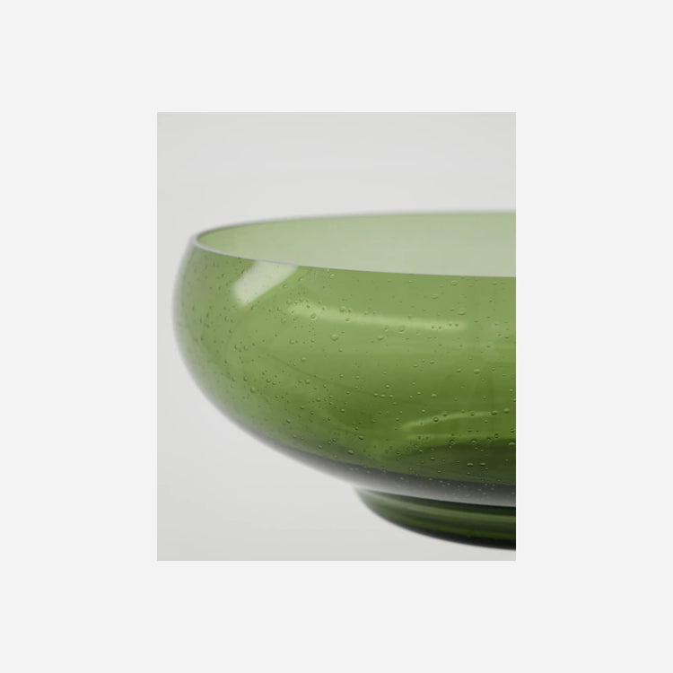 Artfully crafted in soda-lime glass, this exquisite bowl captures attention with its mesmerising green hue and subtle bubble patterns. The translucent surface creates an enchanting interplay of light, whilst its generous proportions make it perfect for both decorative displays and elegant serving.