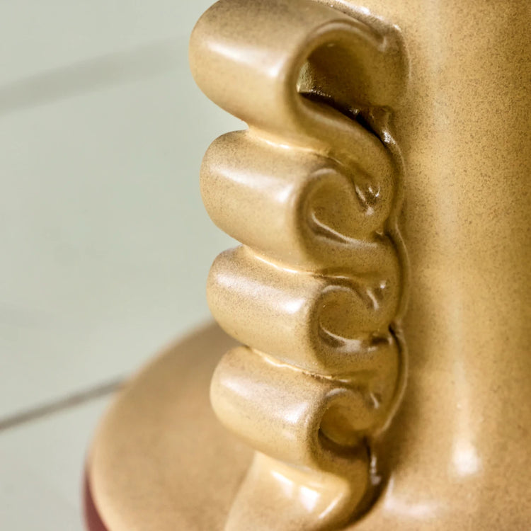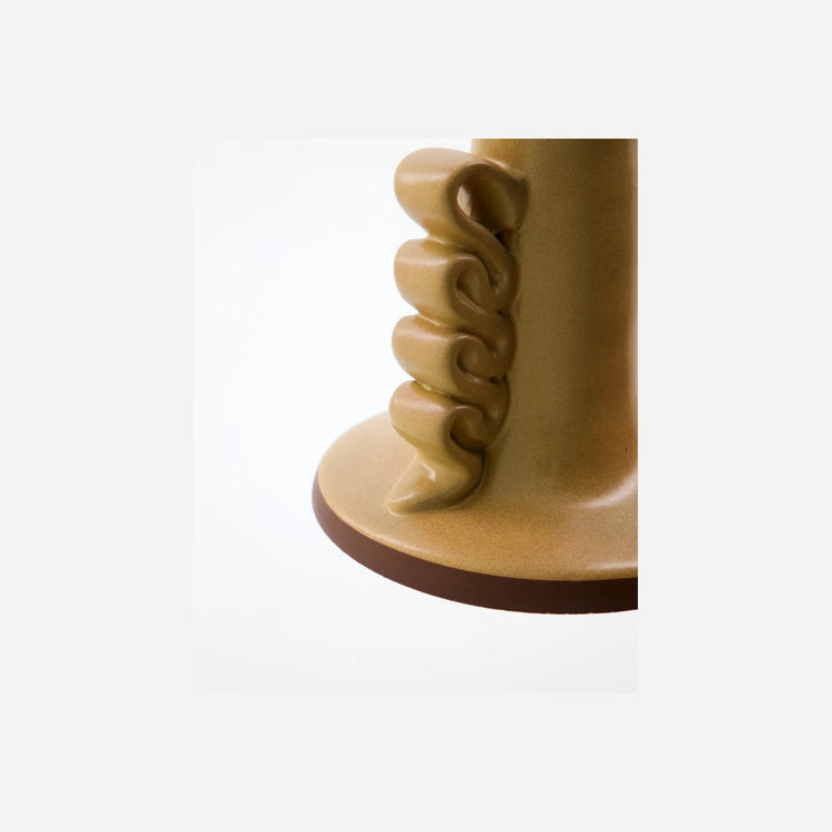 This stoneware candle holder in sand adds personality and playful detail to your décor. Handmade, it blends classic shape with curved decorations along both sides for a sculptural twist and tactile feel.