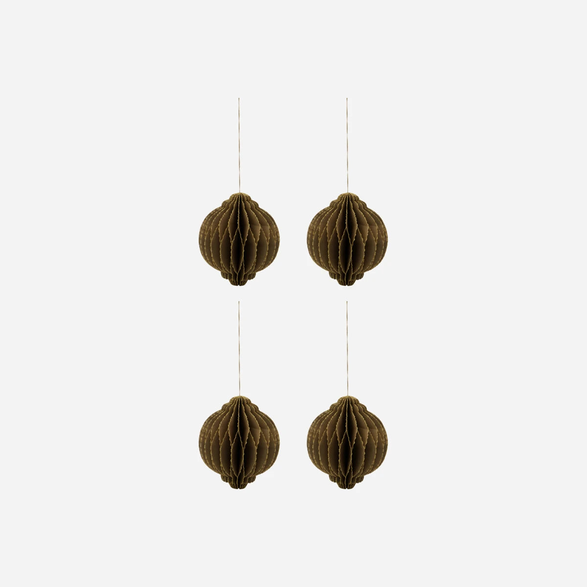 Elevate your festive décor with this set of four handcrafted ornaments. Each ornament features deckled edges and hand-painted gold glitter, adding a touch of elegance. Perfect for hanging on branches or displaying in a decorative bowl.