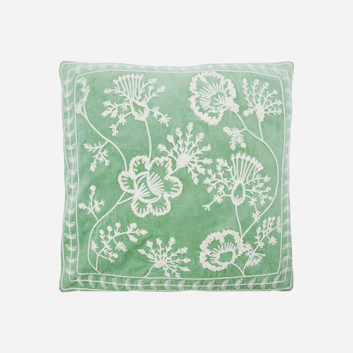 The HDMano cushion cover is made from cotton with a textured off-white botanical embroidery on a mint-green base.