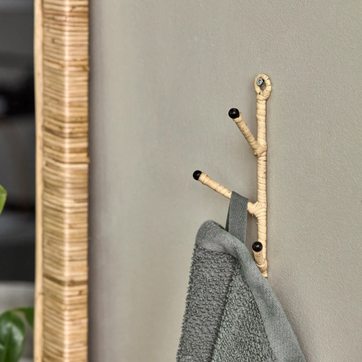 Add warmth and charm to your hallway or wardrobe with this handcrafted hook rack. Made from durable iron wrapped in natural cane, it perfectly balances utility and style. The three black-tipped hooks are ideal for hanging bags, scarves, or towels, adding both function and a welcoming touch to your home decor. Its natural tone seamlessly integrates with any interior, bringing a cosy atmosphere to your space.