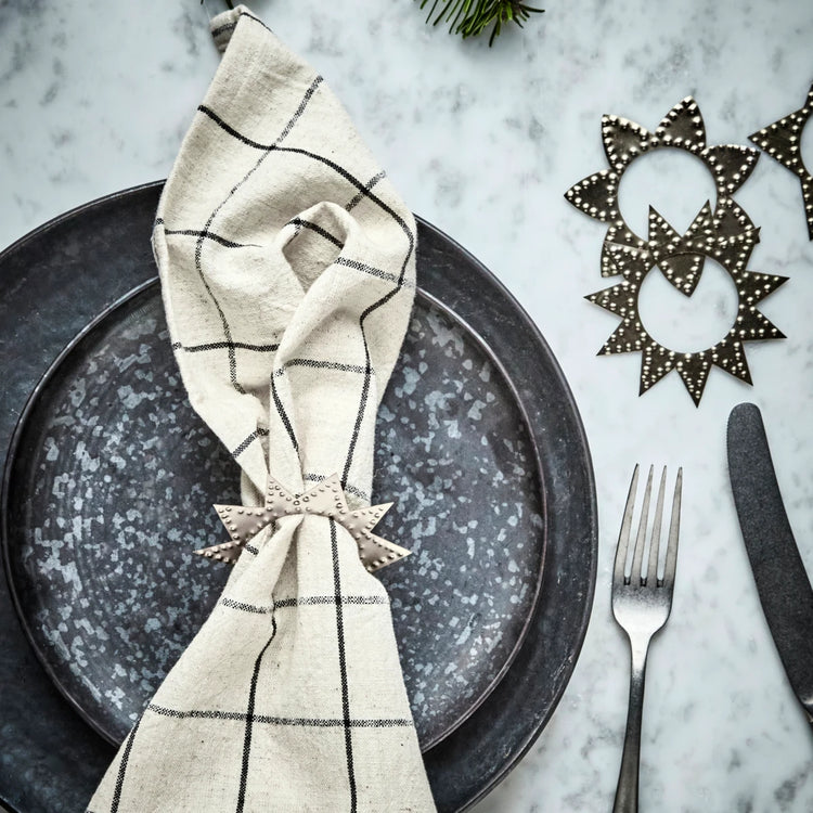 Enhance your dining experience with these exquisite napkin rings in an antique champagne silver finish. Handcrafted and featuring beautiful stamped patterns, this set of four completes your table setting with elegance. Perfect for your festive decor, each ring offers a unique design crafted from durable brass.