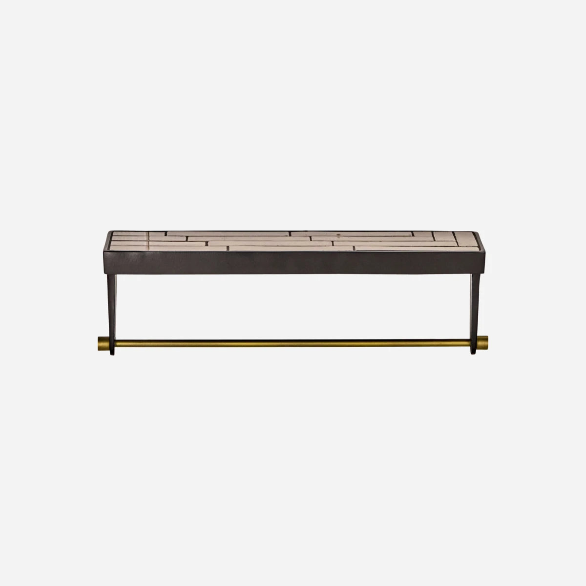 Experience the blend of unique craftsmanship and functionality with this handmade ceramic shelf. Featuring sand-coloured tiles within a sleek black aluminium frame, it brings a touch of sophistication to your bathroom, kitchen, or utility room. The antique brass-finished rod is perfect for hanging towels, offering both practicality and style. Display tea light holders or small vases to personalise your space even further.