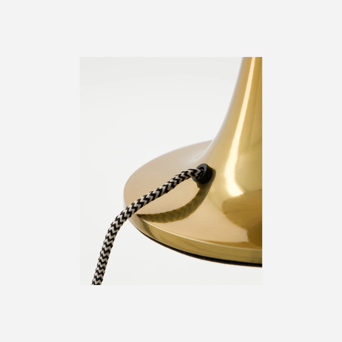 With this table lamp, you can introduce a blend of classic elegance and contemporary charm to any room. Featuring an antique brass tulip-shaped base and a striking off-white lampshade with red stripes, it adds both personality and edge to your decor.- Antique brass tulip base- Off-white/red striped shade- 2-metre patterned cable- E14, Max 7W LEDEnhance your space with this stylish and functional table lamp.