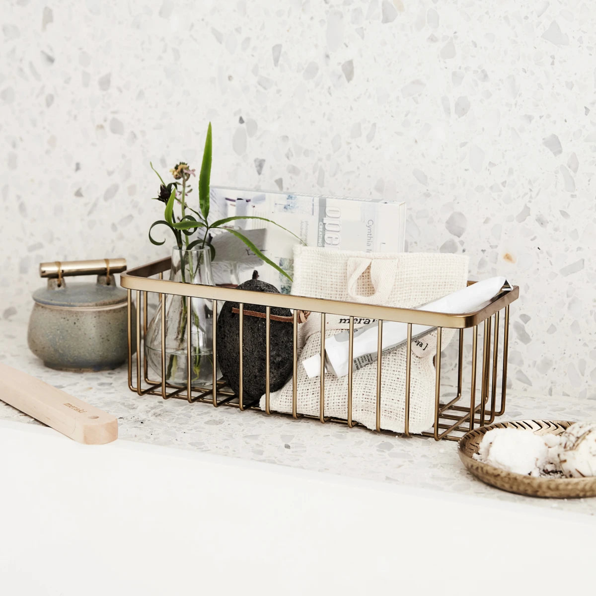 The stylish basket called Bath from House Doctor is ideal for storage in your bathroom. Hang it in your shower to keep your products close by, or place it by the sink to store skincare products and soaps. The basket is made of brushed steel and has an exclusive brass look which brings glow and warmth to your bathroom décor.