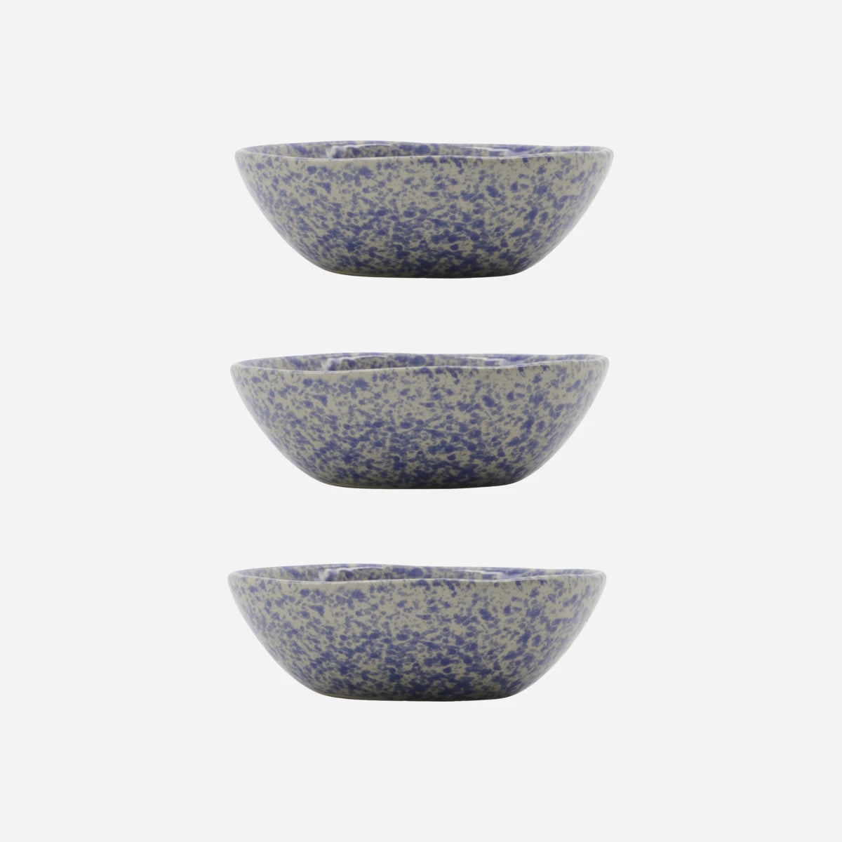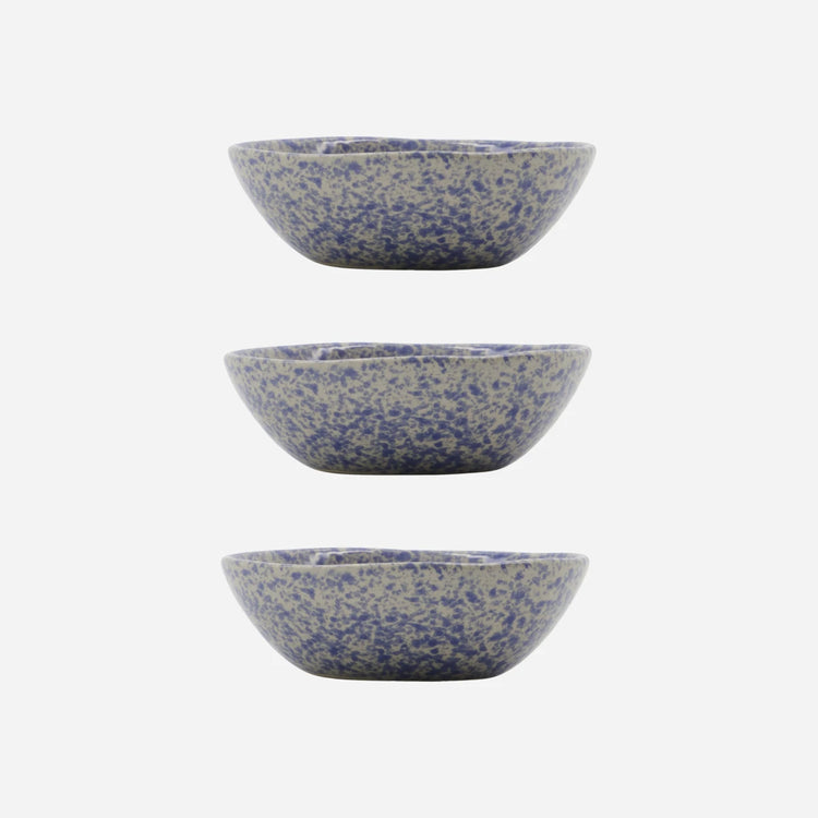 Bring a lively touch to your dining table with this set of 3 handmade stoneware bowls. The off-white base with handpainted blue splash pattern adds a fresh, modern twist, while the organic shape gives each piece its unique charm. Use them to serve snacks by the sofa, fresh fruit in the kitchen, or combine with simple stoneware for an eye-catching place setting. Mix with more colourful pieces to create a playful and inviting table arrangement.