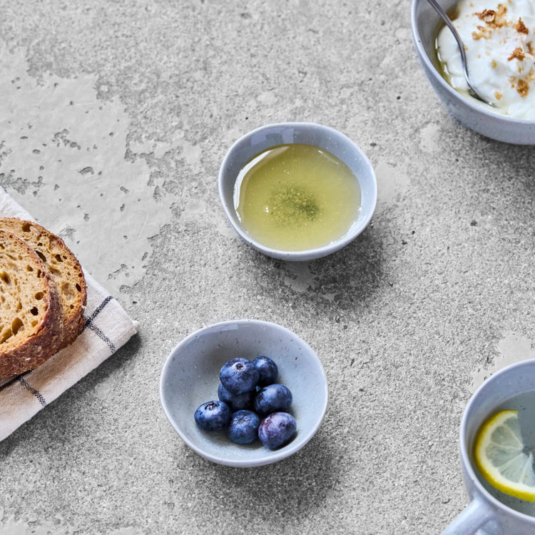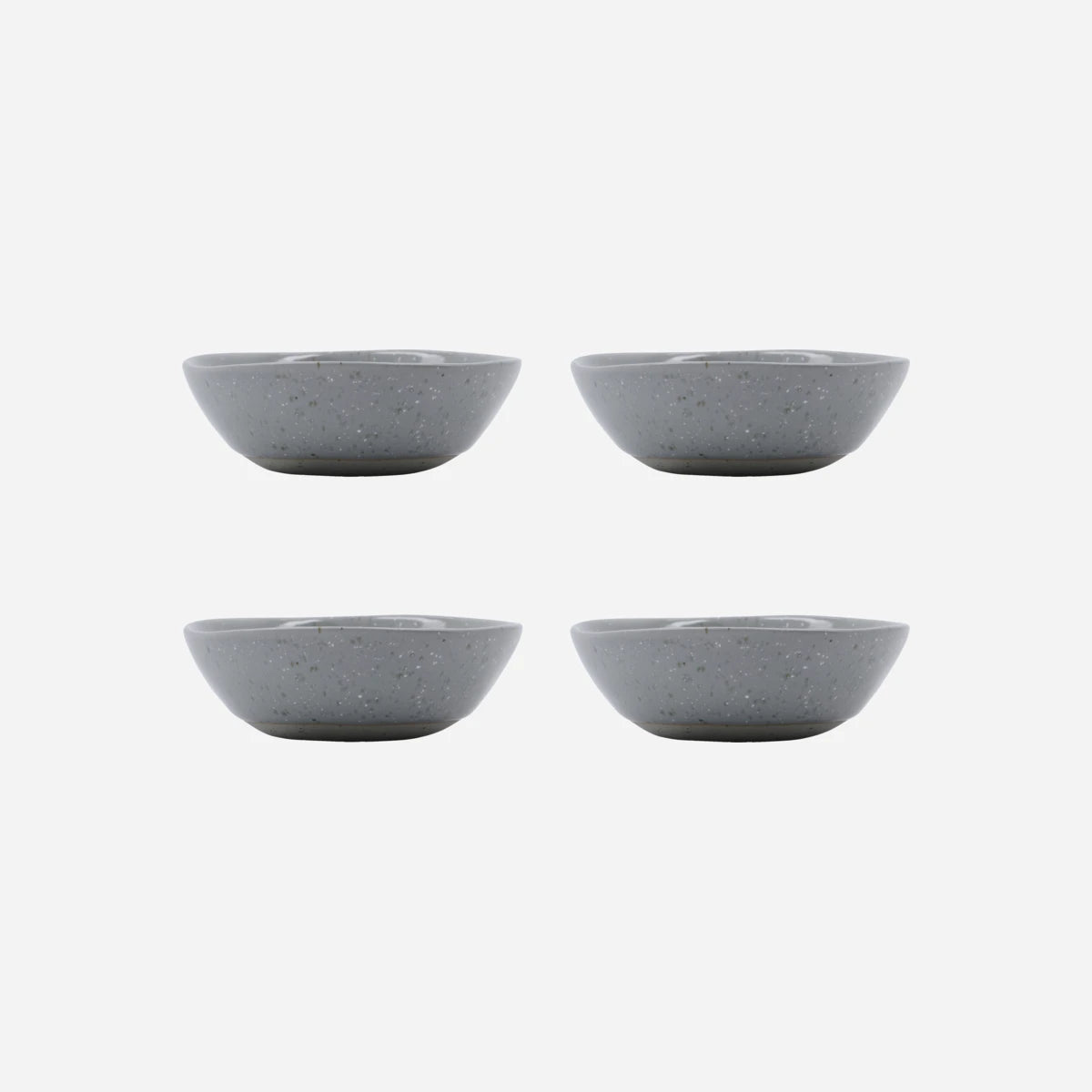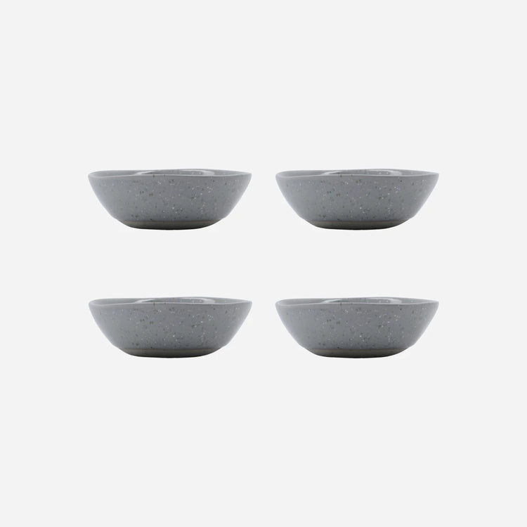 Brighten your table with this set of four handmade stoneware bowls. The light blue reactive glaze and visible raw clay base give each bowl its own personality, perfect for serving dips, snacks, or treats. Mix and match with other ceramic pieces for endless styling options.