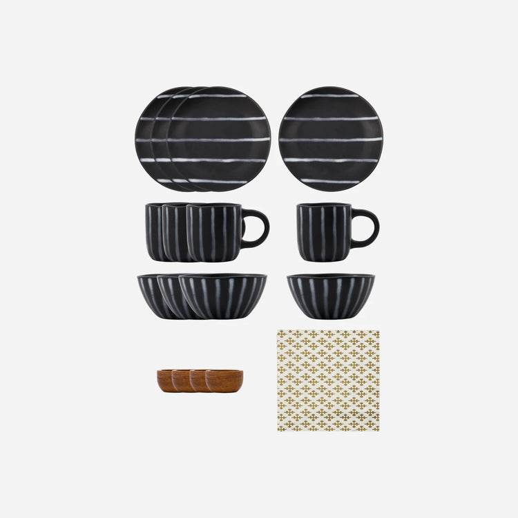 Add a touch of contemporary style to your dining with this black and brown brunch kit. It features a cohesive collection of plates, bowls, cups, egg cups, and napkins, all designed to create a harmonious and stylish table setting. Perfect for casual and formal occasions, each piece complements the others, providing you with a complete and elegant dining experience.