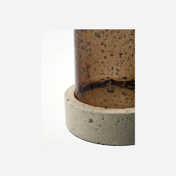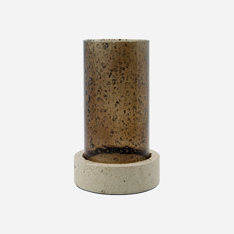 Combining travertine and mouthblown glass, this brown candle holder adds a sophisticated touch to any room. Suitable for tealights, pillar candles, or LED options, it stands beautifully alone or with others in the series.- Handmade craftsmanship- Unique finish and colour- Versatile candle options- Elegant brown hueElevate your decor with this exquisite candle holder.