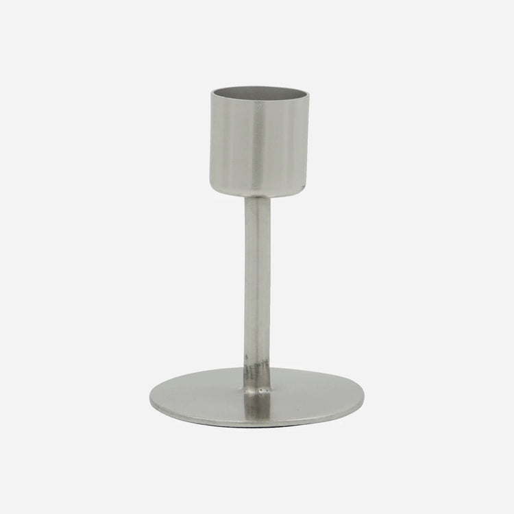 Bring a calm, sculptural feel to your home with this iron candle stand. The minimalist design and brushed silver finish offer a refined touch to your console table or shelf, creating an understated yet elegant focal point.