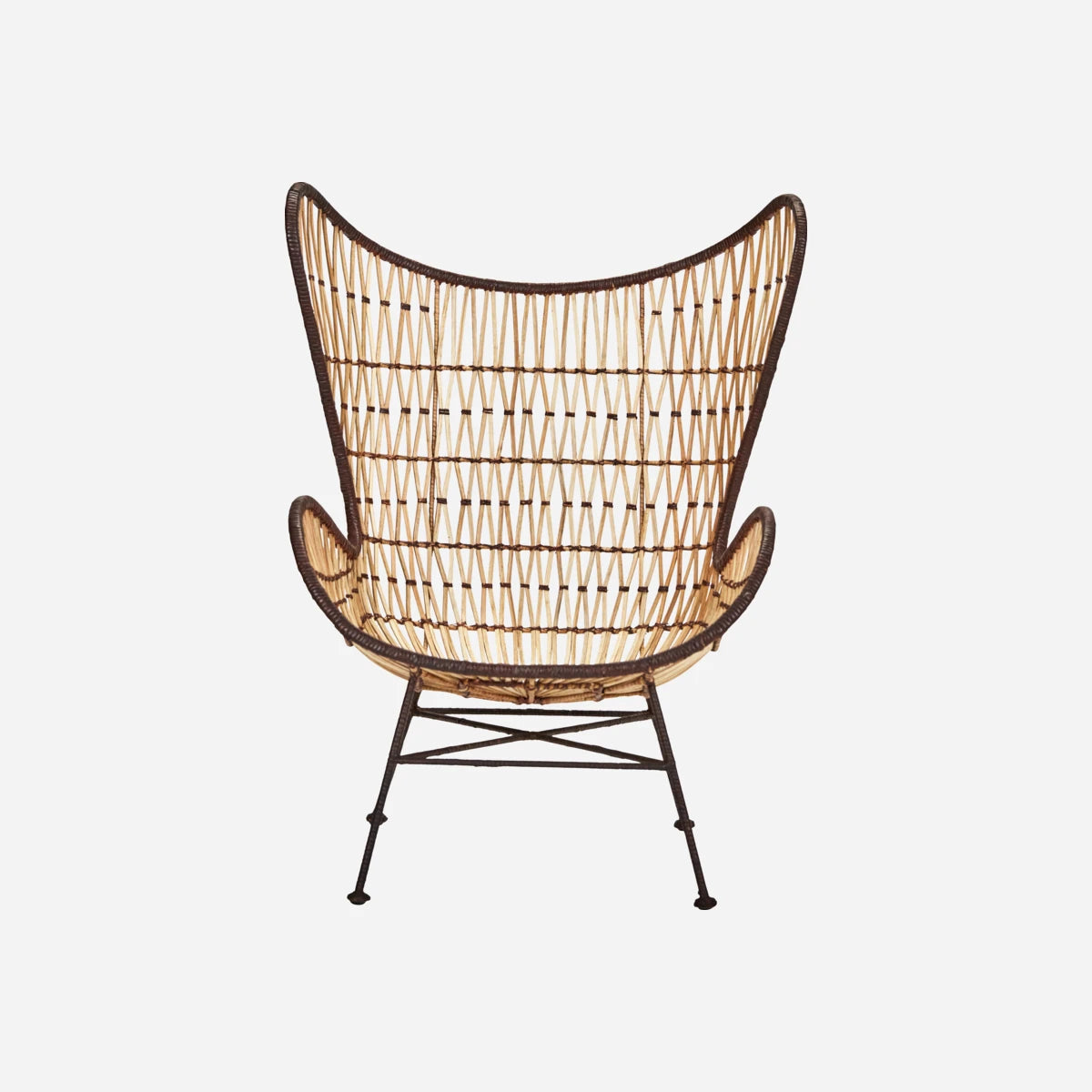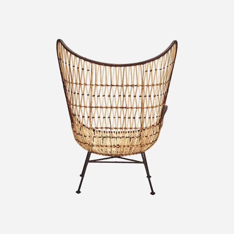 Introducing a stunning lounge chair that combines natural rattan with a sleek black iron frame, offering a truly unique addition to your living space. Its elegant shape is not only a conversation starter but also seamlessly blends with various interior styles, adding a modern yet cozy touch to your home decor.