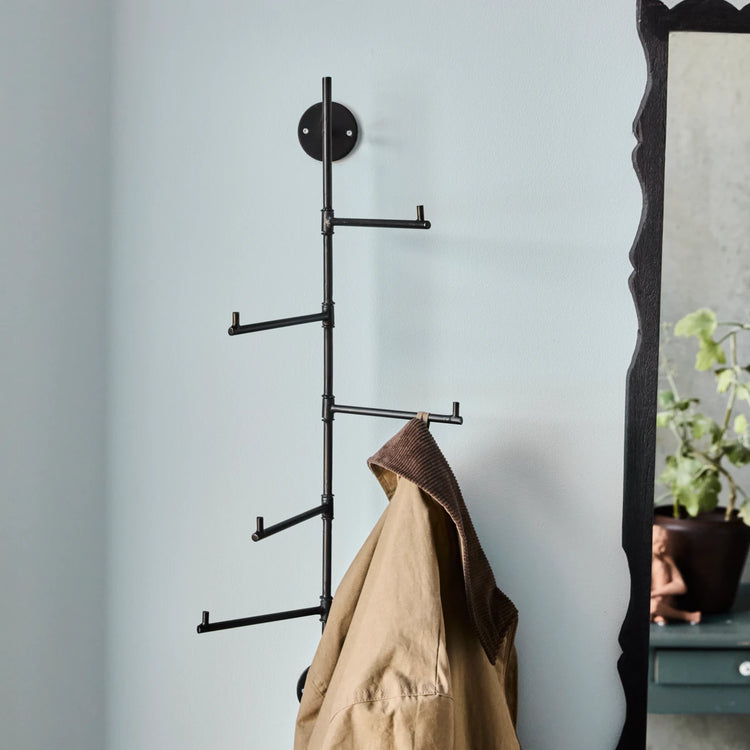 Give your entryway or wardrobe a bold update with this handmade coat rack in sleek black iron. Five adjustable hooks create a striking, sculptural look while offering flexible storage for jackets, bags, or hats. Place it by the door for a practical and artistic touch, or use it in the bedroom to display your favourite accessories.