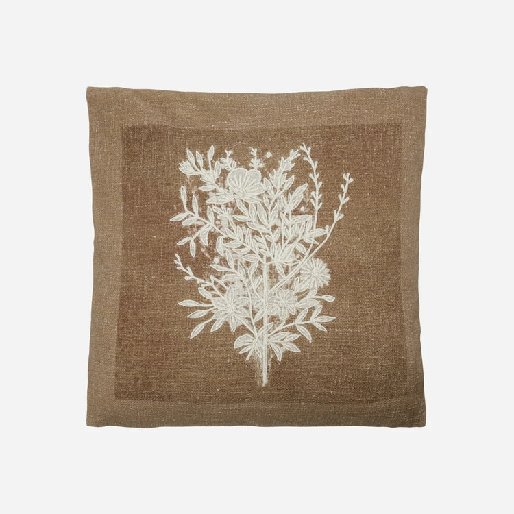 This handmade cushion cover in camel-coloured cotton is adorned with light organza floral embroidery, adding a feminine touch to any home decor. The intricate detailing and rich brown hue create a warm and inviting atmosphere, perfect for any living space.- Handmade, unique piece- Soft cotton material- Elegant floral embroidery- Convenient zipper closureElevate your home decor with this exquisite cushion cover.