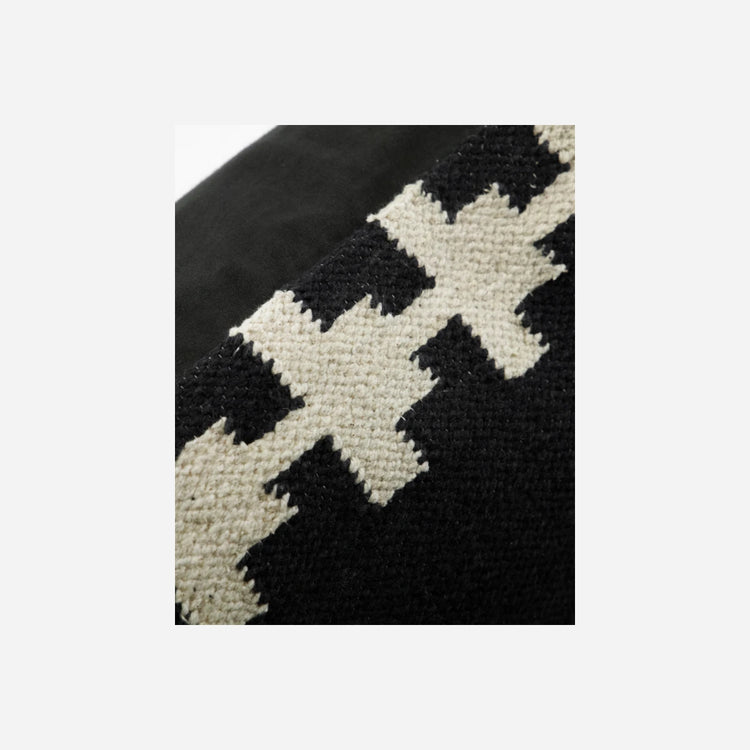 Handmade from heavy cotton, this cushion cover features a striking black and sand graphic pattern, adding an edgy touch to your home decor. The fringes and zipper closure enhance its artisanal appeal, making it a standout piece.- Handmade cotton cushion cover- Striking graphic pattern- Fringes and zipper closure- Each piece is uniqueAdd a touch of artisanal charm to your space.