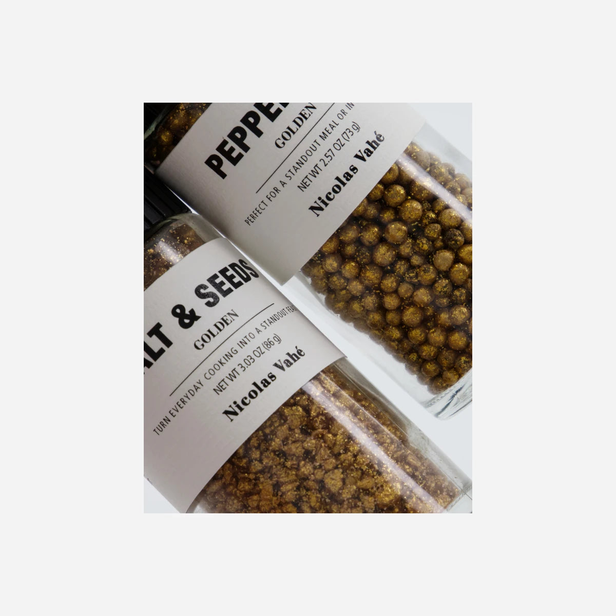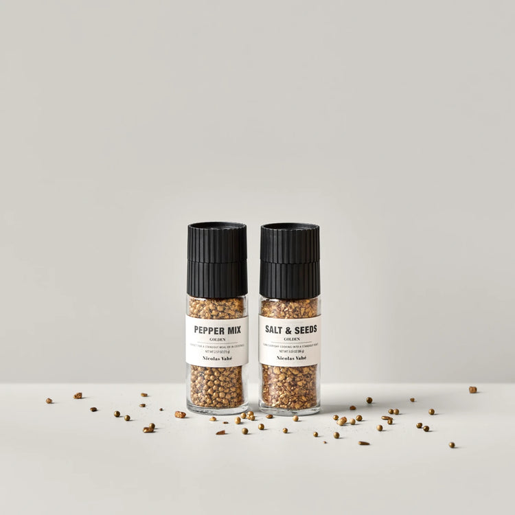 Gift box with a golden pepper mix and a golden salt & seeds blend. Brings flavour, colour, and a subtle festive touch to the table and dishes.