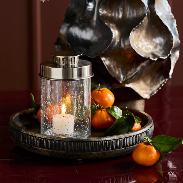 Create a warm and welcoming glow with these mouth-blown tealight holders in clear glass, featuring a playful bubble effect and sleek silver lids. Each piece is unique - perfect for adding a personal touch to your dining table, windowsill, or bathroom. Cluster them together for a striking display, or mix with other tealight holders for a layered and inviting atmosphere.
