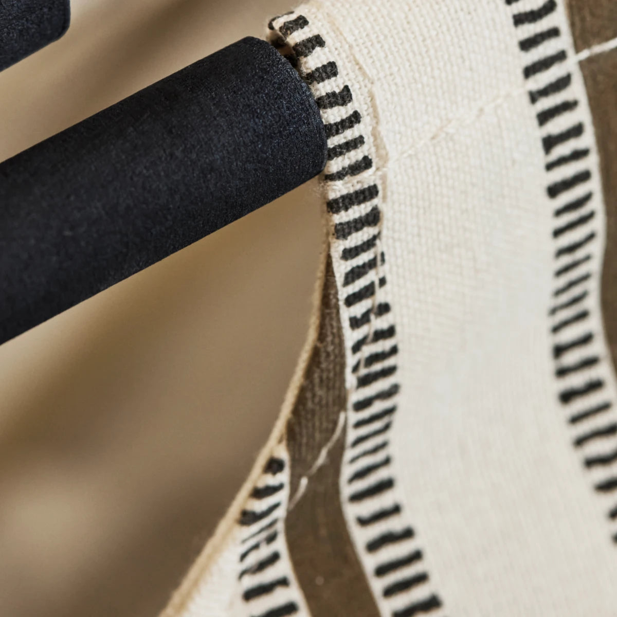 - Ethnic print complements decor.