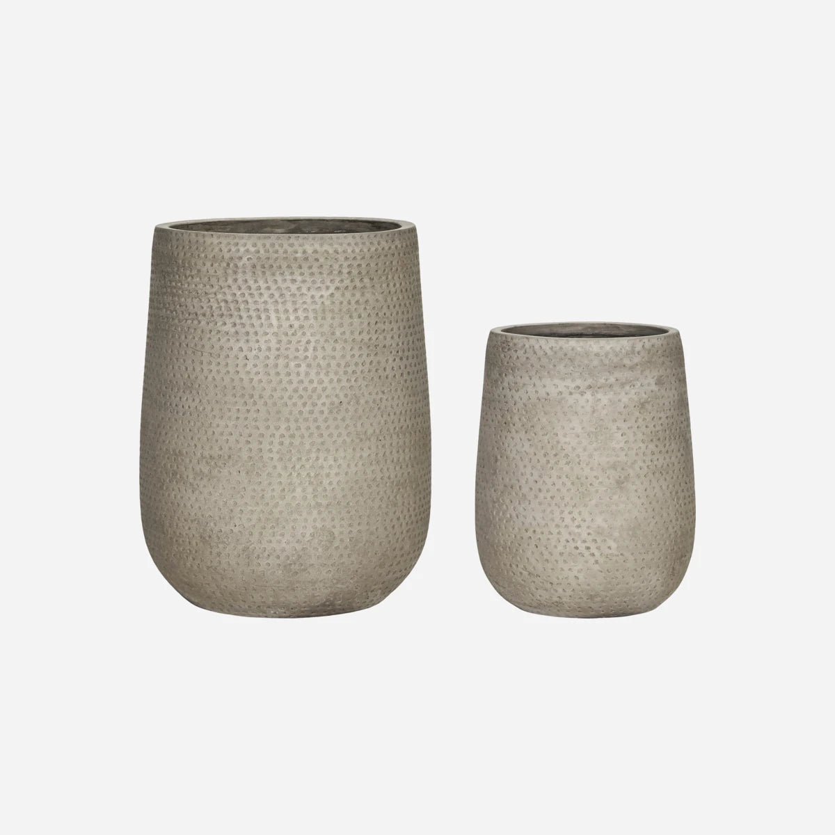 This set of 2 planters from House Doctor gives your outdoor space a contemporary touch. Made of cement and finished with a discreet pattern, the planters enhance the appearance of any plant and suit any mood. Decorate your outdoor area for quiet moments, get-togethers and al fresco dinners with these planters and others in a personal display that brings both life and calm to the setting. Please note that the planters come with drainage holes. Freezing water expands and may cause planters to crack during winter. For that reason, make sure the planter drains well and is sheltered from rain and snow.
