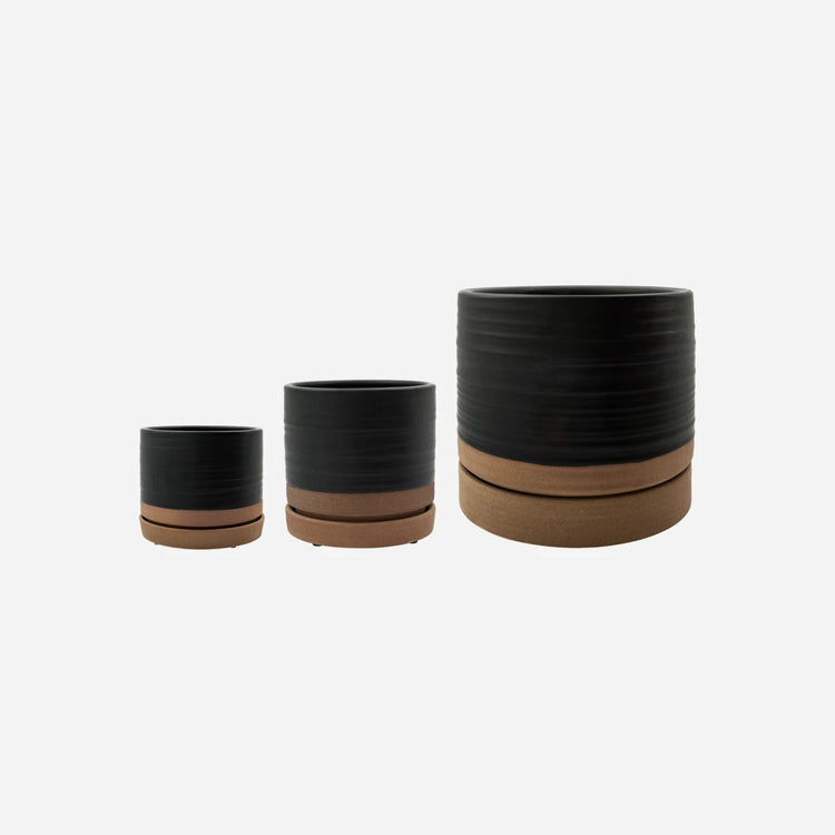 A simple and contemporary addition to your home décor. This set of 3 stoneware planters with saucers from House Doctor comes in 3 sizes to give you numerous opportunities to adorn your living room or hallway with plants. The glaze in a combination of black and sand gives the design a contrasting and not least contemporary look. Place the planters together or in different spots in your living room to create a cohesive look. With a design this versatile, the planters are easy to decorate with.