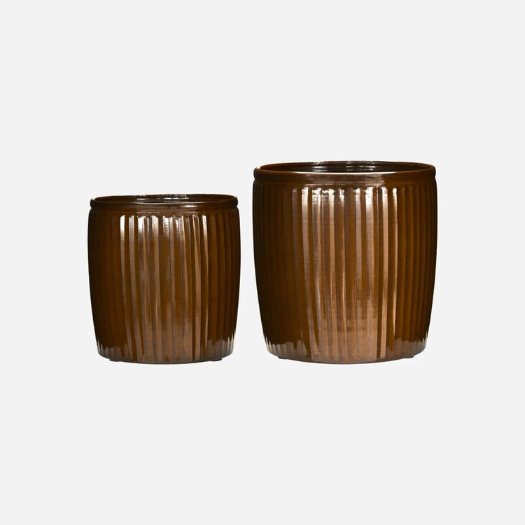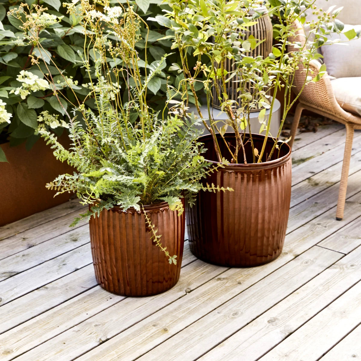 Enhance your outdoor décor with this set of two flowerpots, designed to bring charm and functionality to your spaces. Made from recycled steel with a glossy brown finish, these pots feature a ribbed design that adds a modern and timeless touch. Each pot is equipped with a practical drain hole and plug, ensuring optimal plant care. Ideal for your terrace, balcony, or entrance, these flowerpots beautifully complement a variety of plants with their rich, elegant colour.