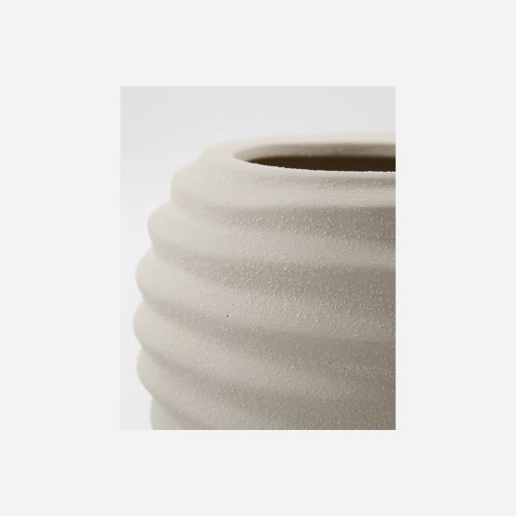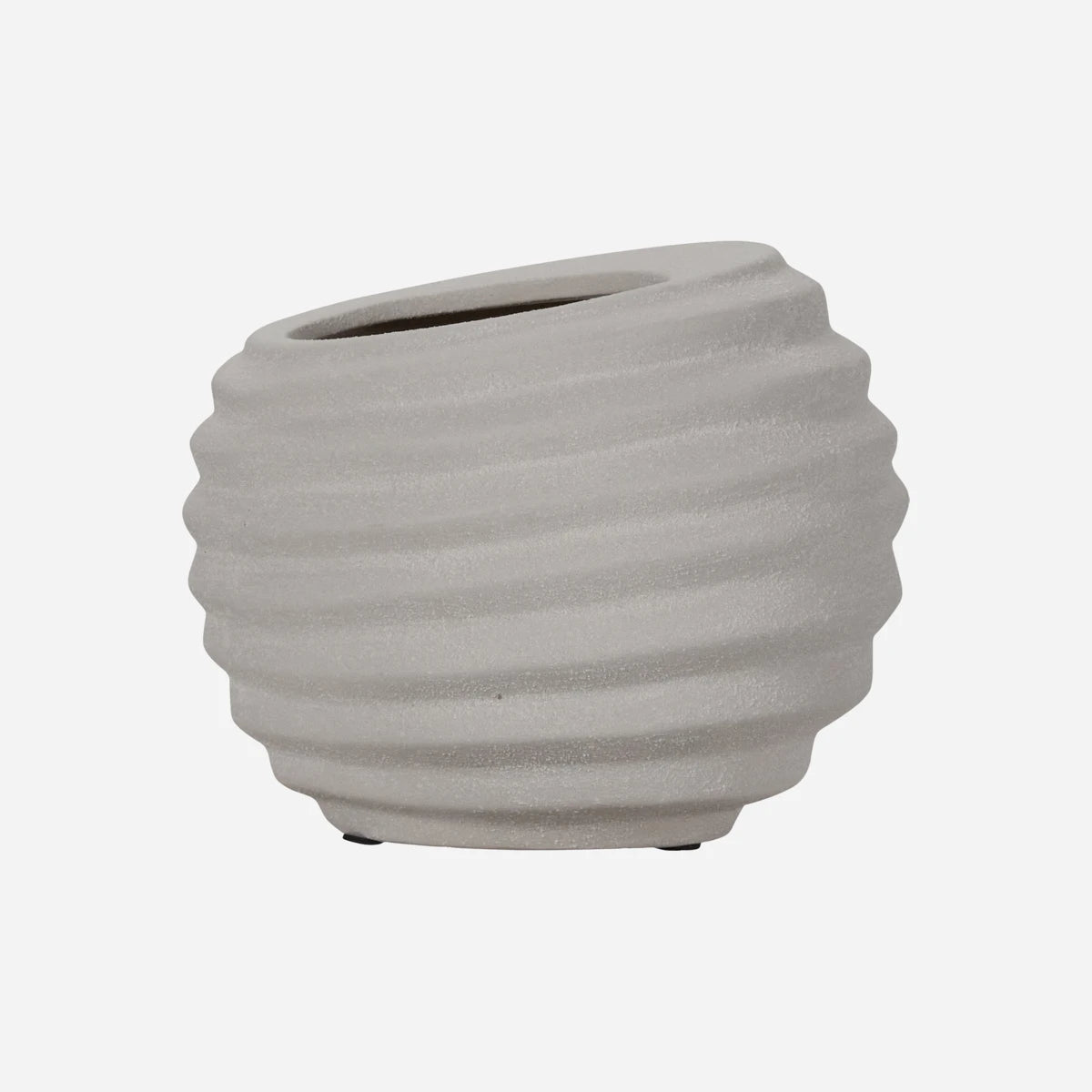 Adding new details to your home decor makes all the difference. This planter from House Doctor comes with a rippled finish for texture and an opening that is a bit off centre. Add a lush, green plant and place the planter on your coffee table, a side board or shelf wherever your home decor needs subtle detailing and a natural touch. This handmade planter has a rustic look and is porous. For this reason, we cannot guarantee that it is completely waterproof. To prevent damage to your surfaces, use a saucer, place the planter on a pad or use an insert.