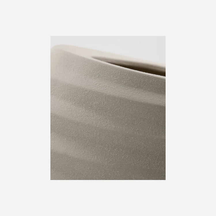 Complete your home decor with the slightest bit of asymmetry. This planter from House Doctor comes with a rippled finish for texture and an opening that is a bit off centre. Add a lush, green plant and place the planter on your end table, a side board or shelf wherever your home decor needs subtle detailing and a natural touch. This handmade planter has a rustic look and is porous. For this reason, we cannot guarantee that it is completely waterproof. To prevent damage to your surfaces, use a saucer, place the planter on a pad or use an insert.